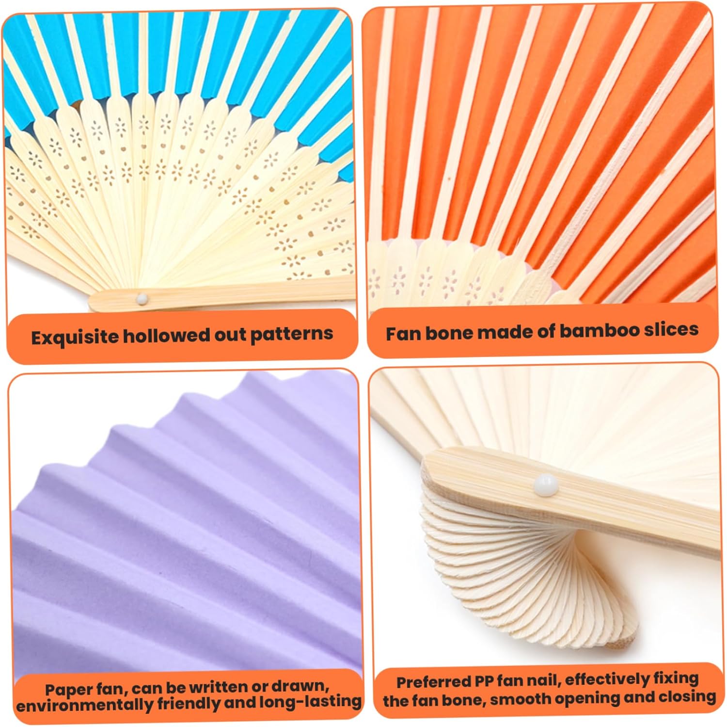 Description: Add a touch of elegance and creativity to your events with these Paper Fans! Each fan features an exquisite hollow pattern and is made from fine bamboo, paper, ensuring durability and a smooth opening and closing motion. These foldable hand fans are perfect for wedding, parties, home decor, and school projects. Whether you're looking to create custom designs or need a unique party favor, these fans are versatile enough for DIY craftsmanshipthey can be written on, drawn upon, and decorated to fit any theme or occasion. The environmentally friendly materials used in these fans make them an excellent sustainable option for those looking to reduce their environmental footprint. The fine fan nails ensure that the fans open and close effortlessly, providing a smooth user experience. Their foldable design allows for easy storage and transport, making them convenient for both indoor and outdoor events. Features:. -Color: Random Color. -Material: Paper Fan + Bamboo Keel. -Size: 21x38 cm/8.27x14.96 inch. Note: Manual measurement, please allow slight errors on size. The colors may exist slight difference due to different screens. Package Including 40 * Paper Fans