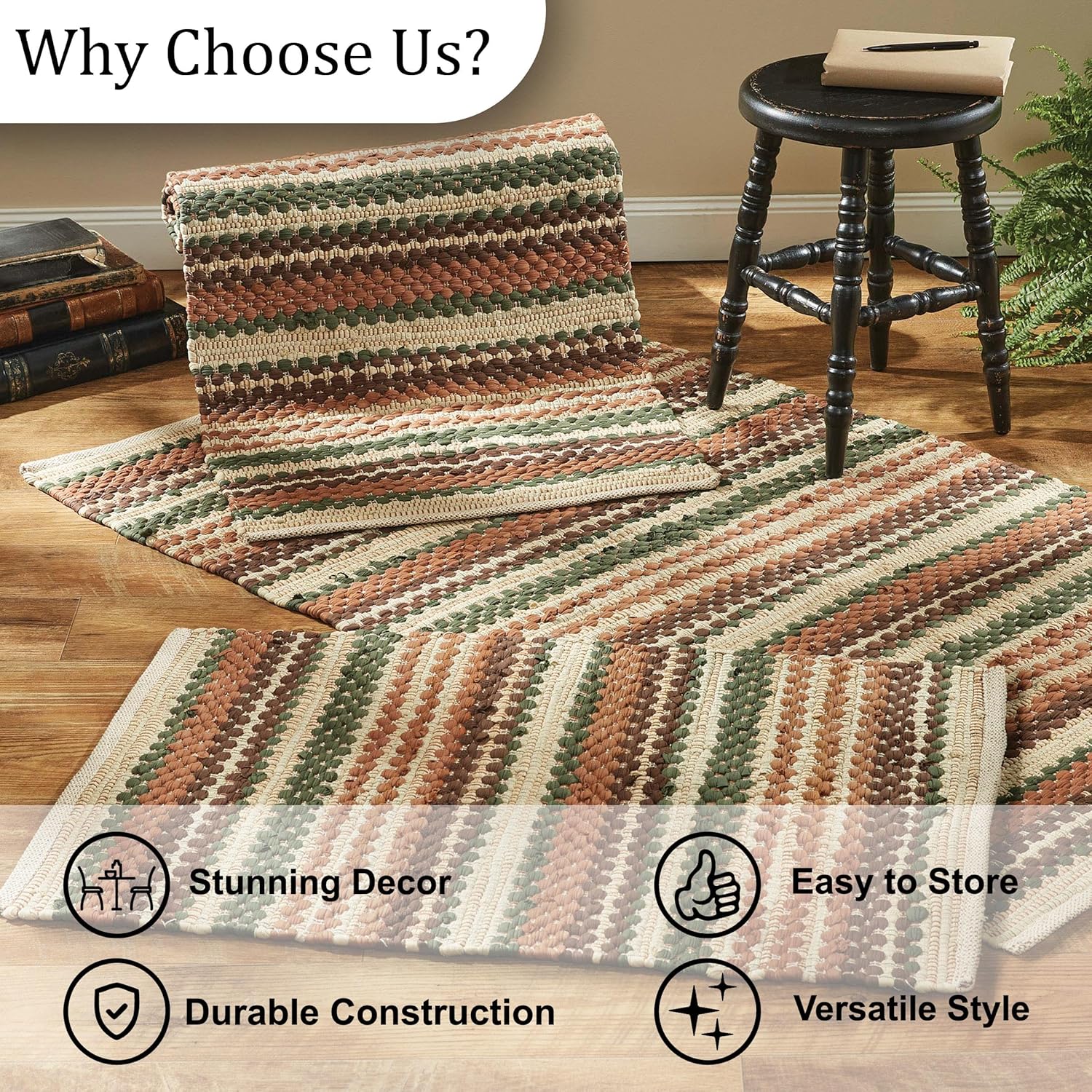Add a luxurious, comforting touch to any room in the house through this braided rug. Earthy elements perfect for a cottagecore style or fall decor addition in your everyday or seasonal home with the natural brown, orange and green hues. This rag rug provides depth to a bedroom or living space that also helps protect your interior flooring from any potential scruffs and marks.