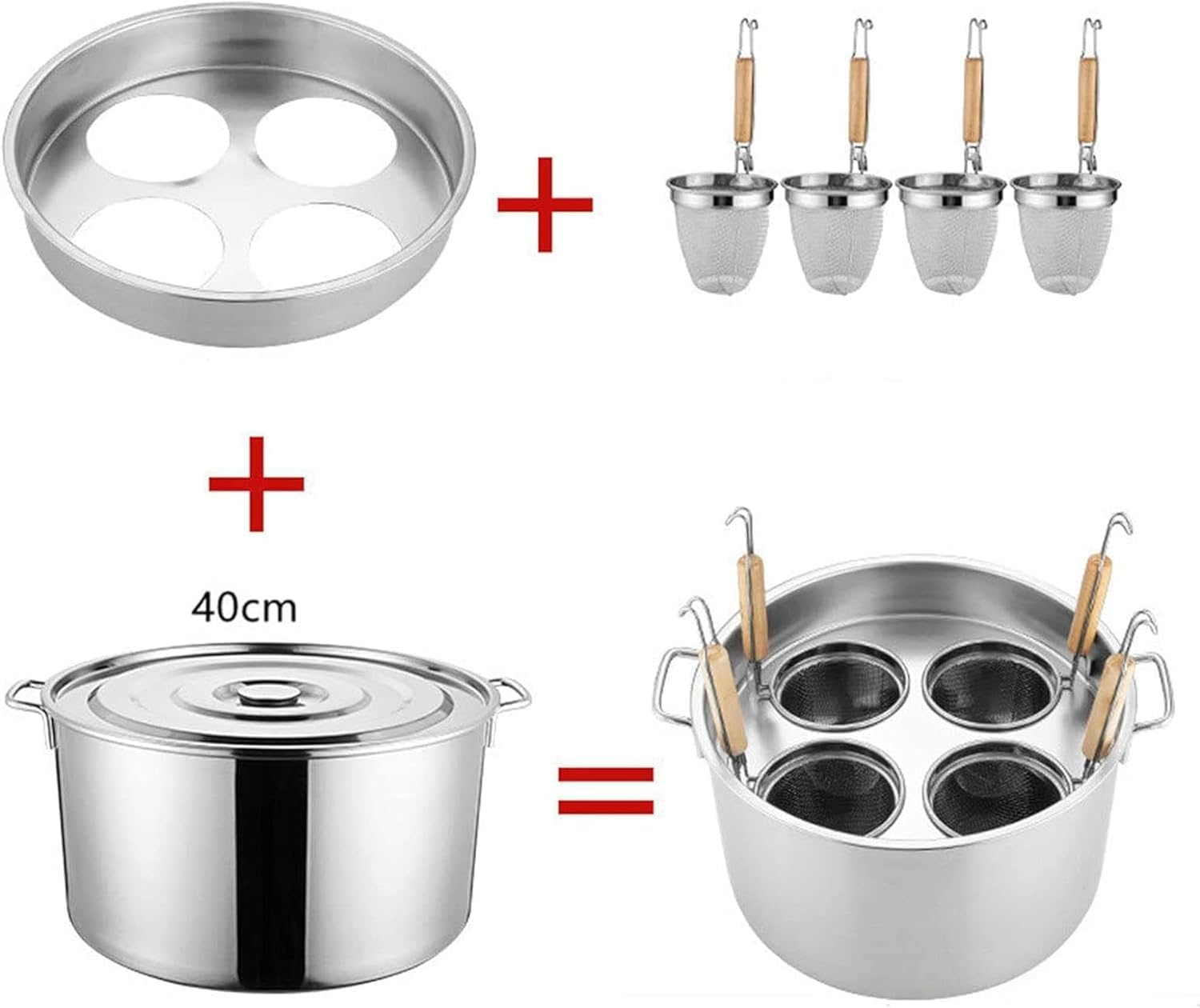 Our Pasta cooker steamer is widely used in cafeterias, restaurants, food stalls and other food production places. It can be used to cook noodles, pasta, dumplings, soup, etc.This Multifunctional Noodle Cooking Pot, Stainless Steel Noodle Cooking Pot with Divider and Colander, Cooking Set for Home Kitchen, Restaurant, Commercial Cooking PotSuitable: Induction Cooktop, Gas, Electric, Ceramic CooktopsSpecifications: Name: Pasta Cooker Insert SetMaterial: 201 Stainless SteelColor: SilverSize:3 Hole Pasta Cooker Pot Size: 22x36.5cm/8.7x14.4 inches4 Hole Pasta Cooker Pot Size: 23x41.5cm/9x16.4 inches5 Hole Pasta Cooker Pot Size: 24x46.5cm/9.4x18.3 inchesInsert Strainer Basket Size: 14x14.5x21.5cm/5.5x5.7x8.5 inchesPackage List:1 x Pasta Cooker Pot1 x Pasta Pot Stand1 x Pasta Cooker Pot Lid3/4/5 x Insert Strainer Basket Feature:1. Mirror finish, Classic looks.2. Inserts strainer basket, Convenient to use.3. Ideal kitchen cookware Multipots to use as pasta pot, spaghetti pot, noodle steamer, vegetables steamer, meat steamer pot stainless steel in one set.