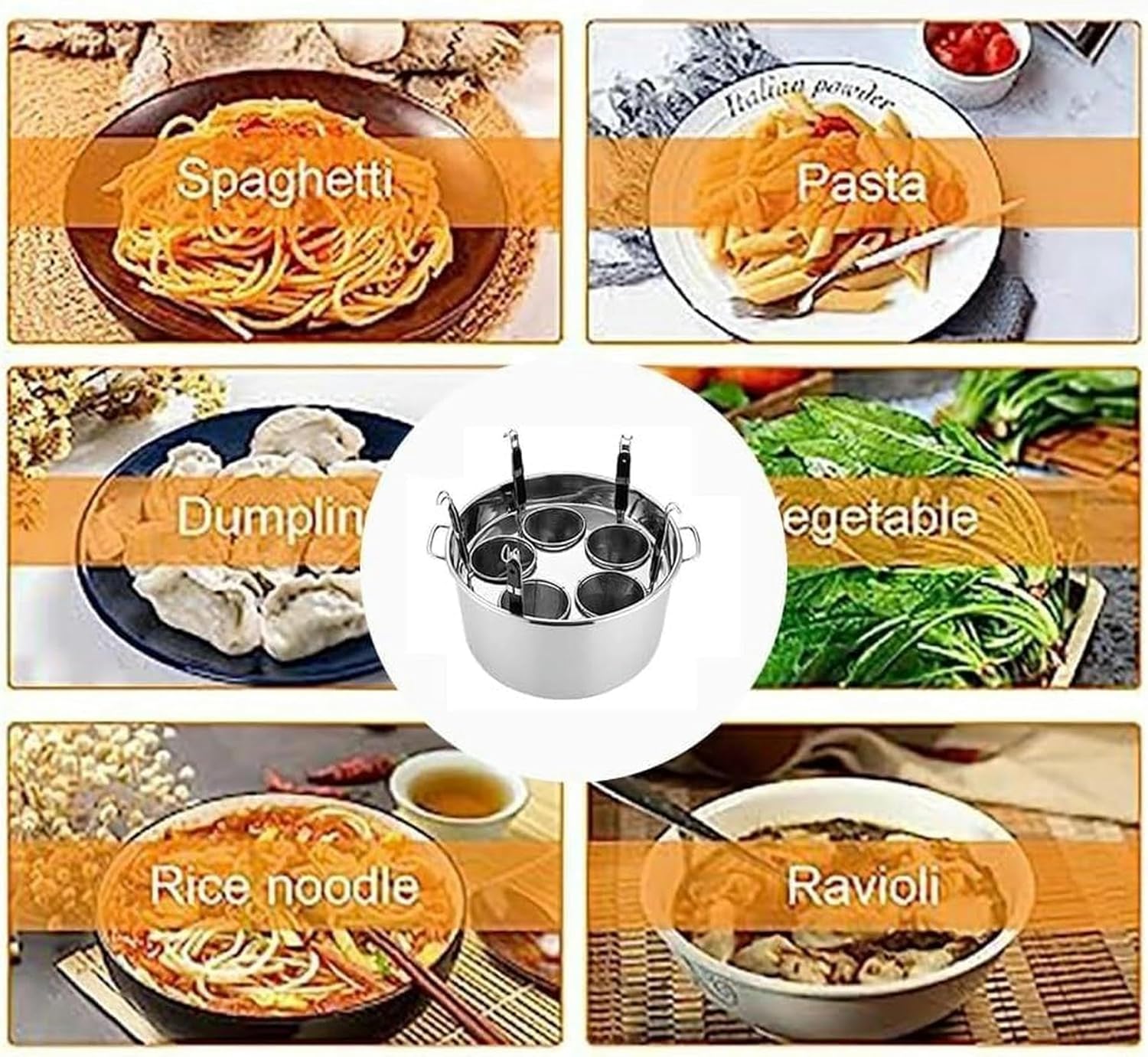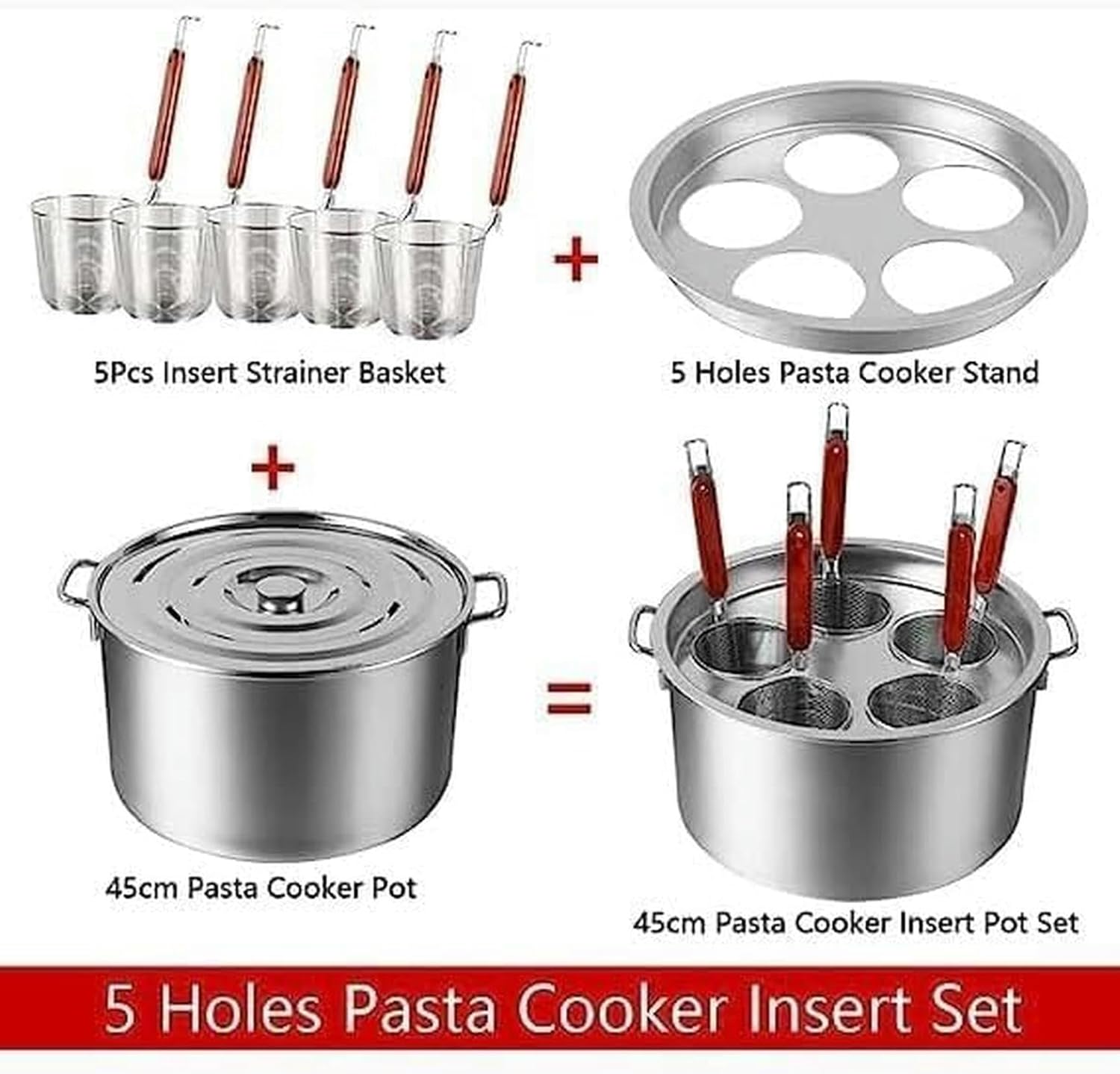 Our Pasta cooker steamer is widely used in cafeterias, restaurants, food stalls and other food production places. It can be used to cook noodles, pasta, dumplings, soup, etc.Product DescriptionThis family-size Pasta Cooker/Steamer Set makes cooking and draining pasta easy. With Inserts strainer basket, dinner has never been easier. Includes a hangable steel lid for healthier, steam cooking.Feature:1. Mirror finish, Classic looks.2. Stainless Steel for Professional Results.3. Aluminum encapsulated base heats quickly and spreads heat evenly.4. Inserts strainer basket, Convenient to use.5. Cool Grip Handles, Dishwasher Safe.6. Ideal kitchen cookware Multipots to use as pasta pot, spaghetti pot, noodle steamer, vegetables steamer, meat steamer pot stainless steel in one set.SpecificationsName: Pasta Cooker Insert SetMaterial: 201 Stainless SteelColor: SilverSize:3 Hole Pasta Cooker Pot Size: 22x36.5cm/8.7x14.4 inches5 Hole Pasta Cooker Pot Size: 24x46.5cm/9.4x18.3 inchesInsert Strainer Basket Size: 14x14.5x21.5cm/5.5x5.7x8.5 inchesSuitable: Induction Cooktop, Gas, Electric, Ceramic CooktopsPackage List:1 x Pasta Cooker Pot1 x Pasta Pot Stand1 x Pasta Cooker Pot Lid3/5 x Insert Strainer Basket