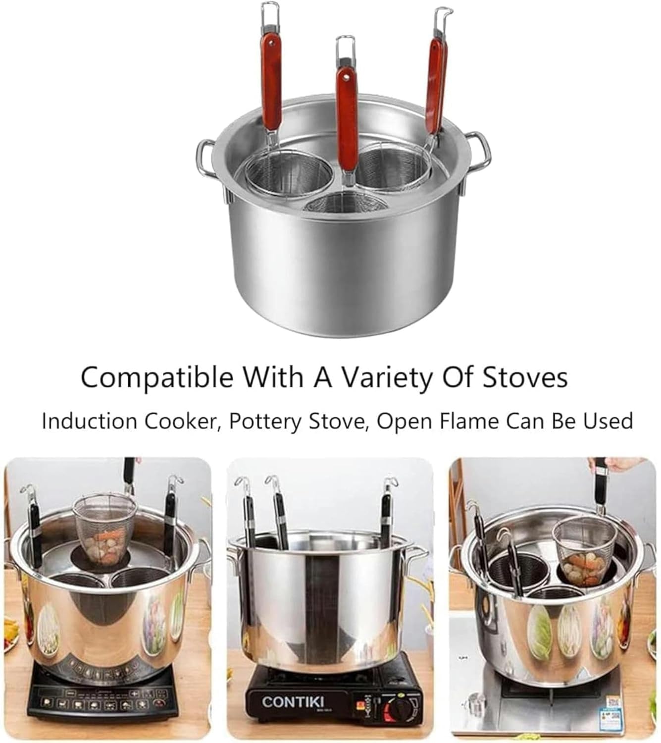 Our Pasta cooker steamer is widely used in cafeterias, restaurants, food stalls and other food production places. It can be used to cook noodles, pasta, dumplings, soup, etc.This family-size Pasta Cooker/Steamer Set makes cooking and draining pasta easy. With Inserts strainer basket, dinner has never been easier. Includes a hangable steel lid for healthier, steam cooking.Feature:1. Mirror finish, Classic looks.2. Stainless Steel for Professional Results.3. Aluminum encapsulated base heats quickly and spreads heat evenly.4. Inserts strainer basket, Convenient to use.5. Cool Grip Handles, Dishwasher Safe.6. Ideal kitchen cookware Multipots to use as pasta pot, spaghetti pot, noodle steamer, vegetables steamer, meat steamer pot stainless steel in one set.SpecificationsName: Pasta Cooker Insert SetMaterial: 201 Stainless SteelColor: SilverSize:3 Holes Pasta Cooker Pot Size: 36x21.5cm/14.2x8.5 inches4 Holes Pasta Cooker Pot Size: 41x23.5cm/16.1x9.3 inches5 Holes Pasta Cooker Pot Size: 46x26cm/18.1x10.2 inches6 Holes Pasta Cooker Pot Size: 51x28cm/20x11 inchesInsert Strainer Basket Size: 11x13x34cm/4.3x5.1x13.4 inchesSuitable: Induction Cooktop, Gas, Electric, Ceramic CooktopsPackage List:1 x Pasta Cooker Pot1 x Pasta Pot Stand1 x Pasta Cooker Pot Lid3/4/5/6 x Insert Strainer Basket