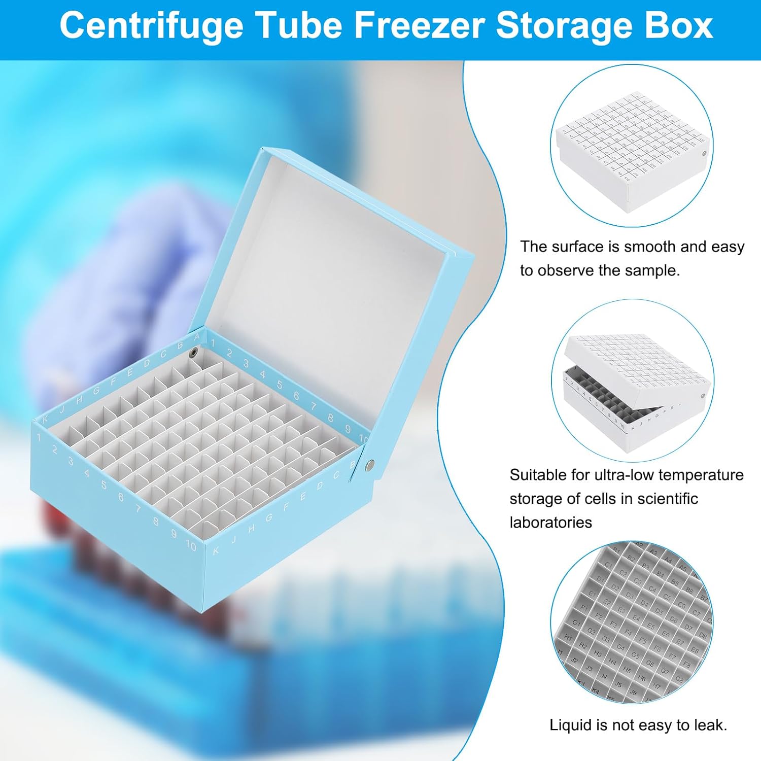 The Centrifuge tube freezer storage box is a good helper for storing frozen sample tubes or centrifuge tubes in laboratory experiments.SpecificationMaterial: CardboardColor: White, BlueApplicable Capacity: 0.5ml, 1.5ml, 1.8ml, 2ml Hole Size: 12 x 12mm / 0.47 x 0.47 Inch (L*W)Overall Size: 130 x 130 x 50 mm/ 5.12 x 5.12 x 1.97 inch (L*W*H)Number of holes: 100 WellPackage List: 6 x Centrifuge tube freezer storage box (3 Pcs of each color)Advantage1. The centrifuge tube freezer storage box is reusable, acid and alkali resistant, and suitable for storing 1.8ml or 2.0ml low-temperature bottles.2. Each bracket is marked with a corresponding number to facilitate recording and searching of sample information. When the box is closed, the pipes are securely held inside and are not prone to leaking. Even after long-term storage, the liquid remains clean and contamination-free.InstructionIt is simple to use, just put the cryogenic bottles into the corresponding rack according to the serial number.NOTEClean and dry the centrifuge tube freezer storage box before use.