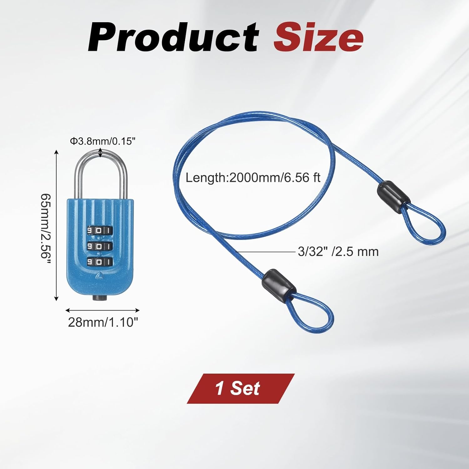 Reasons for Selection - Double loop security cable is crafted from premium stainless steel, which features rust prevention, corrosion resistance, high toughness and aging resistance. Equipped with a zinc alloy 3-digit combination lock, the password wheel rotates smoothly without jamming, allowing it to be opened without a key and providing reliable protection.Measurement - Steel Cable Size: 2000 x 2.5 mm / 6.56 ft x 3/32 inch (L*D); Combination Size: 28 x 65 mm / 1.10 x 2.56 inch (W*H); Shackle Diameter: 3.8 mm / 0.15 inch; Package Include: 1Pcs x Steel Cable and 1Pcs x 3 Digit Combination Lock.Suitable for - Bicycle cable lock is suitable for locking helmets, bicycles, motorcycles, sports equipment, fences, toolboxes, suitcases, etc., effectively preventing loss and ensuring the safety of your belongings, which can also be used as a clothesline, net hanging device, animal leash and binding strap.Installation - The default combination is 000. Press and hold the reset button into the slot, then enter your new combination. Thread the security steel cable through the items you need to secure, and then lock it with a lock.Kind Tips - Please confirm the size before purchasing. It is recommended to apply lubricant regularly to extend the lock's lifespan.