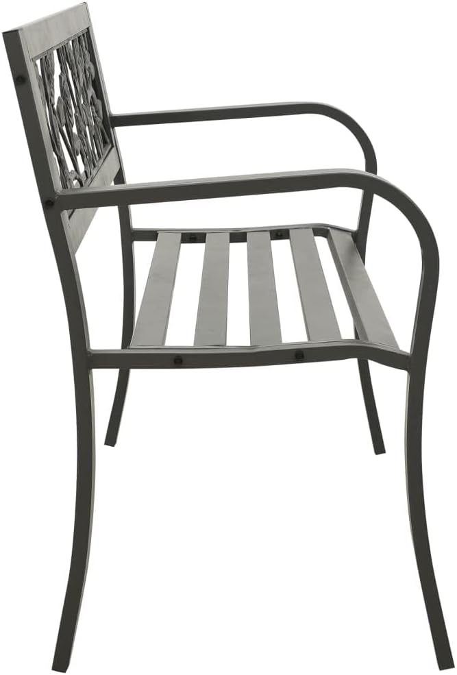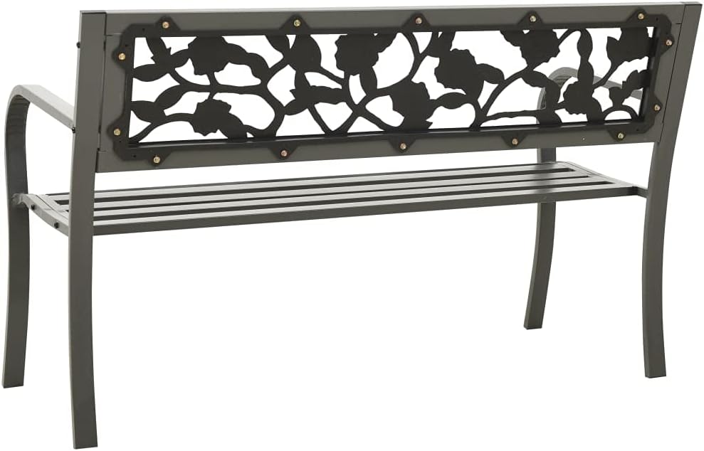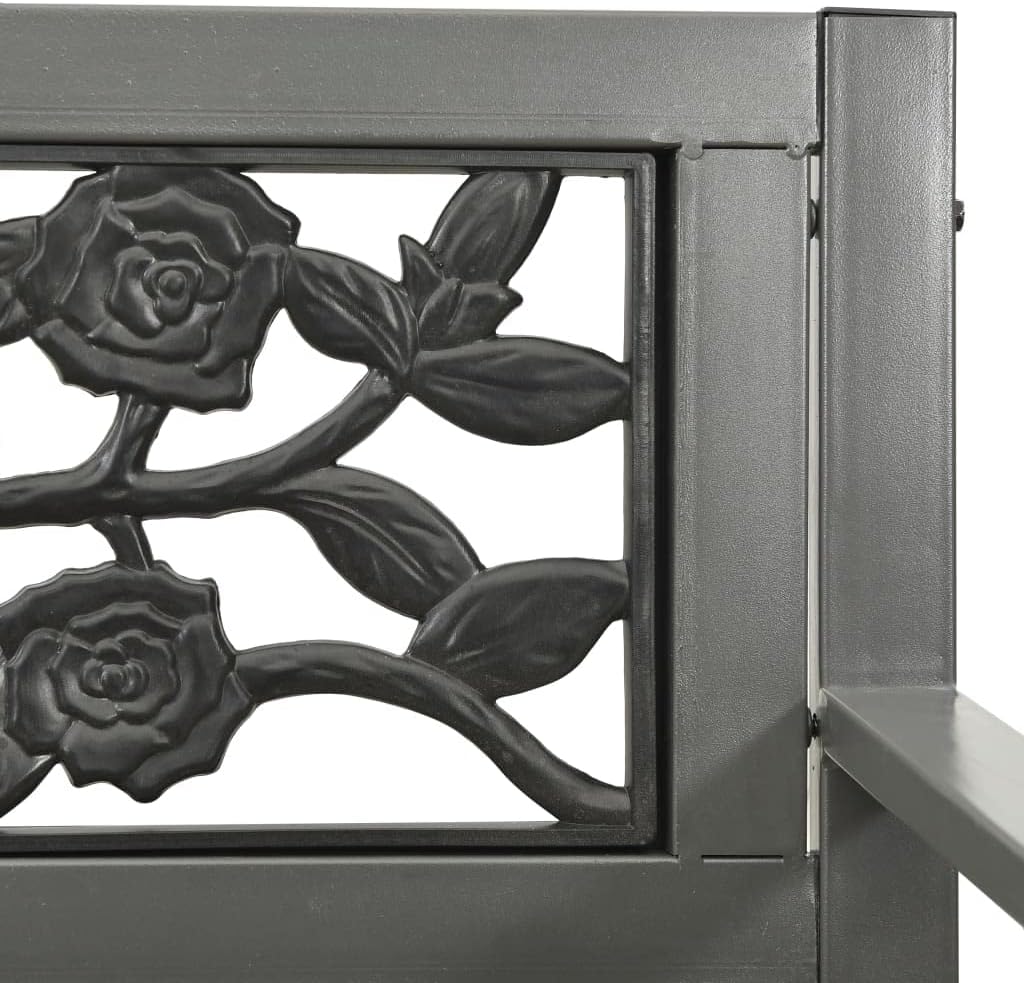 This patio bench, with its vintage style, is a real eye-catcher and gives a pleasant feel to any garden or outside space.Made of powder-coated steel, the bench is weather-resistant and highly durable. The decorative rose-patterned plastic backrest adds a classy accent to any garden or patio. It also makes a perfect addition to the front of your home.Color: GrayMaterial: Powder-coated steel, plasticDimensions: 49.2" x 20.9" x 30.3" (W x D x H)Seat depth: 13"Seat height from the ground: 15.7"Armrest height from the ground: 24.8"Max. loading capacity: 242.5 lbAssembly required: Yes