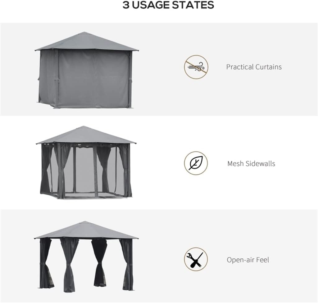 - LARGE PATIO CANOPY: This gazebo 10x10 features a steeple roof design and creates the space for outdoor use on decks and patios and in parks and backyards.- STURDY & STABLE: This outdoor gazebo canopy features powder-coated metal columns for long-lasting use, and eight ground stakes are included for added stability.- PRACTICAL CANOPY TOP: This deck gazebo has a polyester fabric roof with a PA coating, giving it water and UV fighting property and providing a full range of protection from light rain to sunny days. The built-in grommets throughout the fabric help ensure proper water drainage.- PROTECTED SIDEWALLS: The fully enclosed zippered sling mesh netting with doubled curtains protects you from annoying elements and the sun while adding more privacy. This patio gazebo also has a double-track system that allows you to slide each layer with ease.- BACKYARD GAZEBO DIMENSIONS: Overall Size: 9.7'L x 9.7'W, Eave Height: 6.3', Top Height: 8.5'. Distance between columns: 8.1'. Assembly required.- Water drainage hole at each corner to prevent water accumulation- Assembly requiredSpecification:- Color: Black Column, Dark Grey Polyester, Black Mesh- Material: Metal, Polyester, Nylon Netting- Overall Size: 9.7' L x 9.7' W- Eave Height: 6.3'- Top Height: 8.5'- Distance Between Columns: 8.1'1 x Gazebo8 x Ground Stakes1 x Manual(Other demo items not included).Note:Due to different monitors and lighting effects, the actual colour of the product may differ slightly from the colour shown in the pictures. Thank you!Please allow 1-2 cm deviation due to manual measurement.The side wall of the net blocks unwanted guests with wings, and the side curtains can prevent wet environment.
