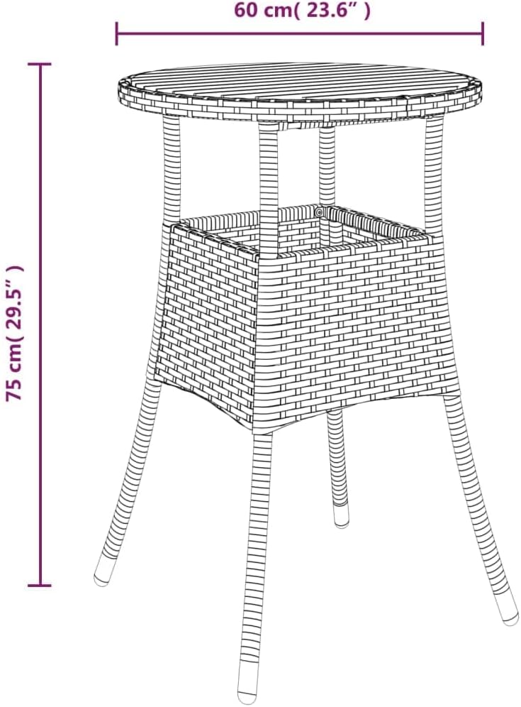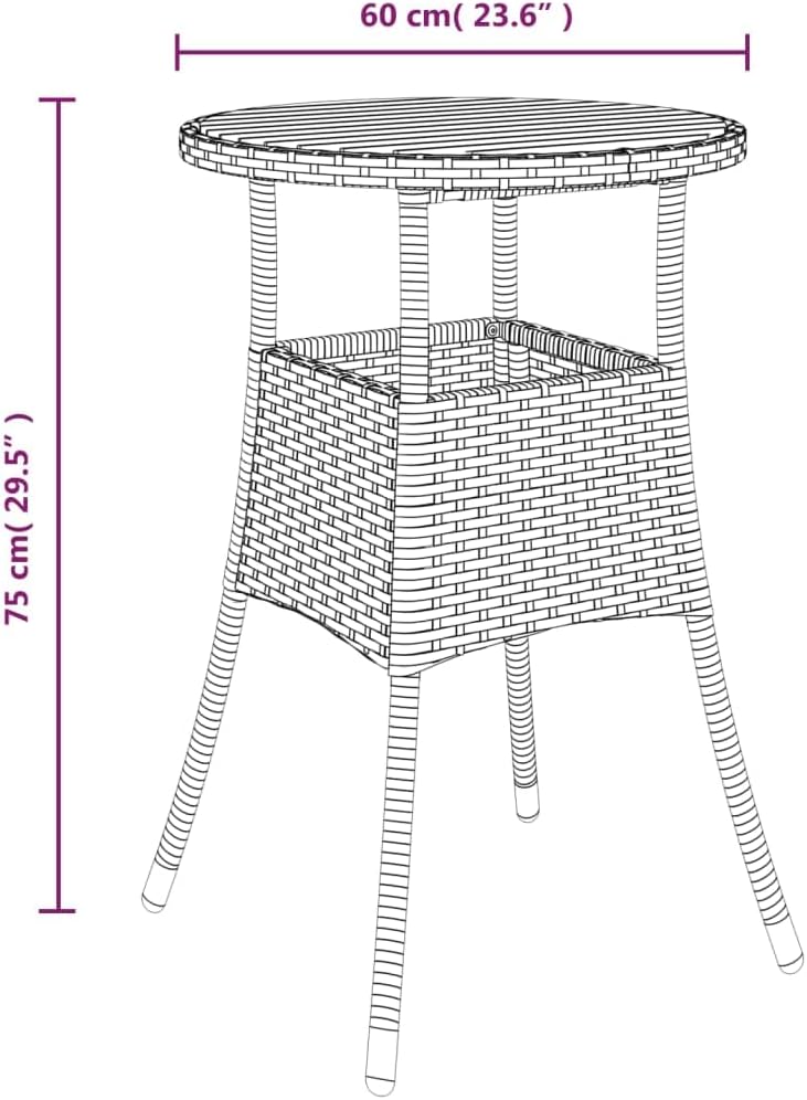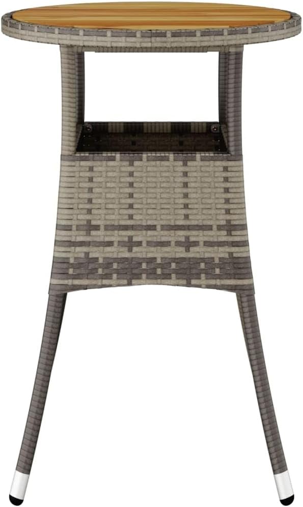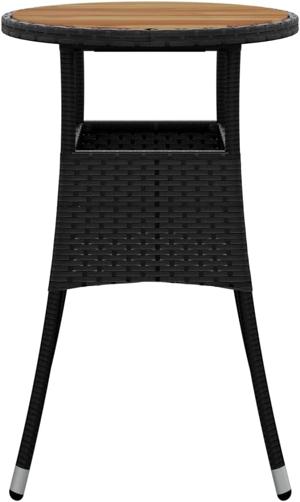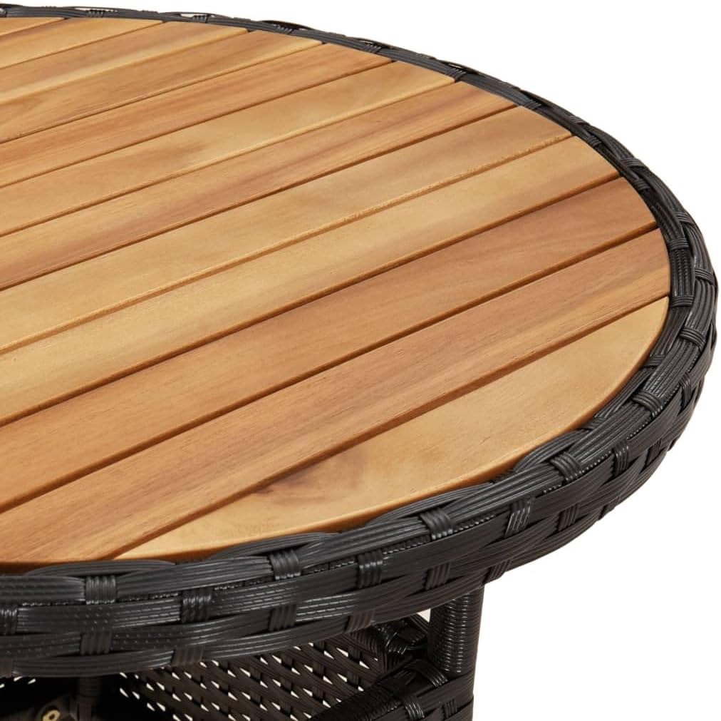 Combining both style and function, this garden table is the centerpiece of your garden, patio or any other living space.Featuring a powder-coated steel frame wrapped with poly rattan, the outdoor table is durable. Its tabletop is made of solid acacia wood, a hardwood with dense grains. This beautifully-designed patio table is stable, durable and eye-catching. Additionally, the exquisite craftsmanship and beautiful wood grains make every piece slightly different from the next.Note: In order to extend the life of your outdoor furniture, we recommend you to protect it with a waterproof cover.Color: BlackMaterial: Poly rattan, powder-coated steel, solid acacia woodDimensions: 23.6" x 29.5" (Diameter x H)With protective rubber for woodAssembly required: Yes