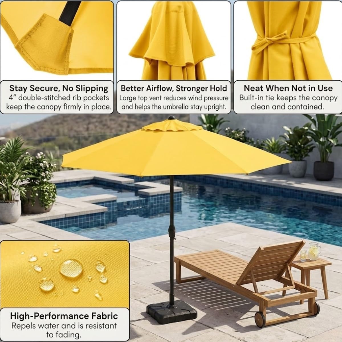 • Outdoor Umbrella Canopy: Made from thick polyester fabric to withstand daily sun exposure. This UV protective and water resistant cloth keeps your patio table umbrella canopy dry and prevents fading over time