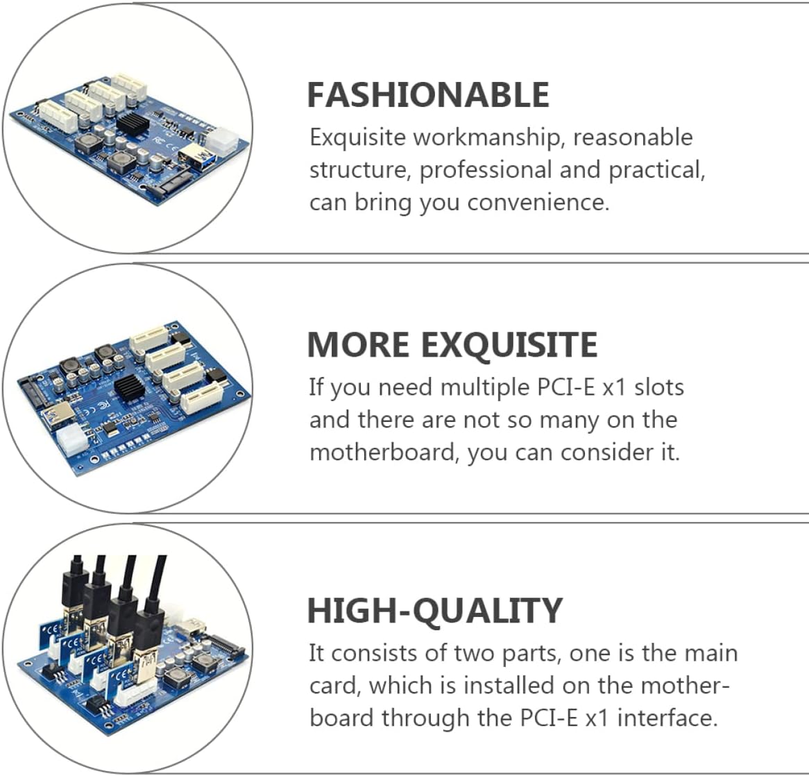 Package List 1 x PCIE adapter card 1 x expansion card 1 x USB cable Features -Size: 11.00X6.90X1.90cm/4.32X2.71X0.75in PCIE Extender -Material: ABS PCIe Riser -Color: Blue Computer Supply - But even with USB 3.0, the theoretical bandwidth is only 5Gbps (625MB/s). If you divide it into four and remove the loss, it will only be 150MB/s. Even the single- bandwidth of PCI-E 1.x is 250MB/s PCI Express Extender. - It is simple in design, but very practical in use, which brings great convenience to you PCI Express Extension Adapter. - PCI-E 1X multi-interface card solves the situation that the desktop computer doesn't have enough PCI-E ports PCI-E Extender. - Therefore, this thing can give you the slots, but not enough bandwidth. It is only suitable for places where performance is not required PCI-E Riser. - Special design and it is in fine craftsmanship. It is the replacement for your old, broken one PCI Express Riser.Goods InformationPCI Express Extension Adapter Features the ABS material, which has high durability, not easy to deform.PCI-E Adapter Card This PCI express riser adapter is made of material, which can withstand long-lasting use.PCI-E 1X to 4X Converter Fine workmanship, ensures practicality