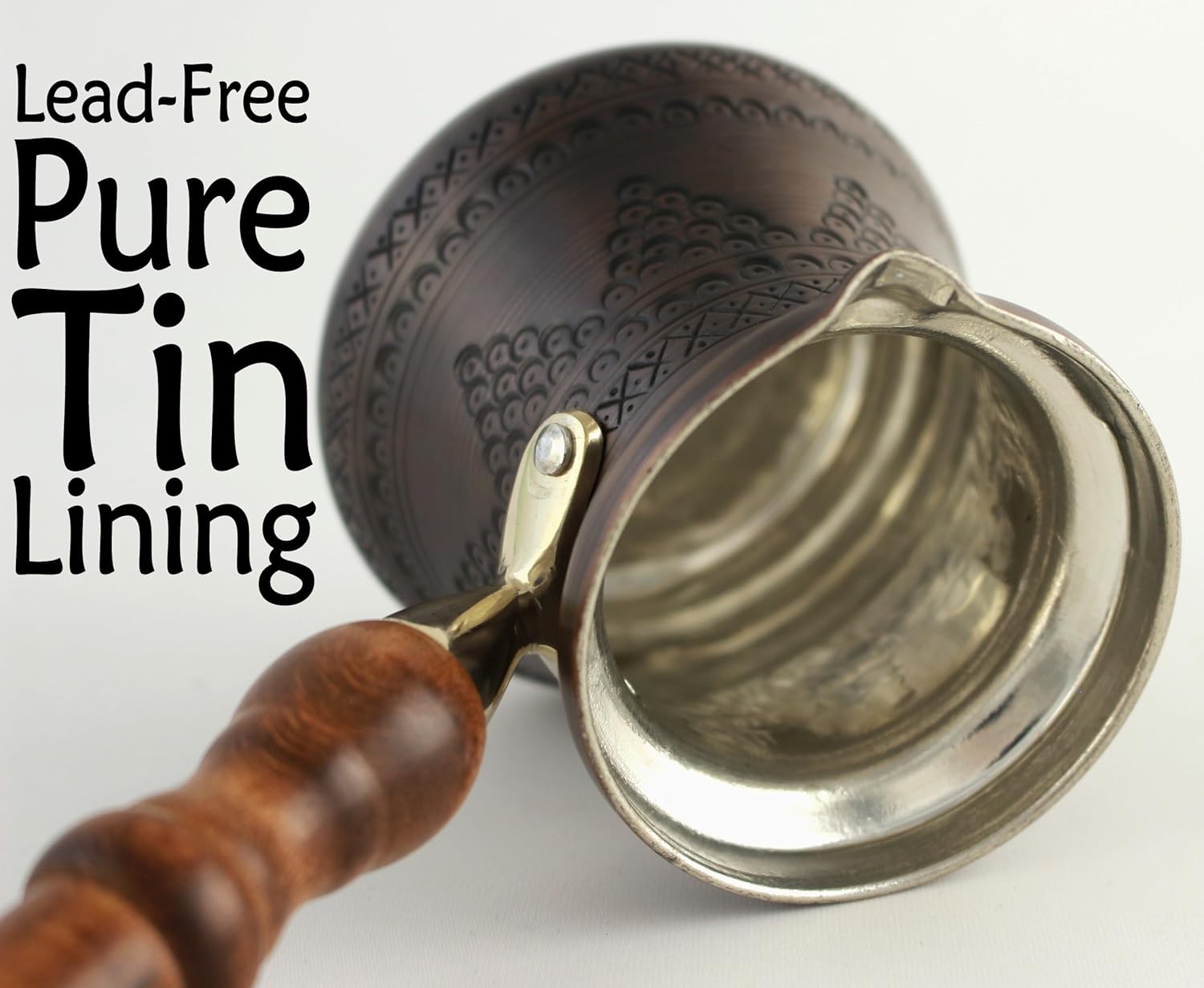 Model Number: DD-PCZ-M-AModel Name: PCZ Series (Medium) Copper Coffee PotDesign: Body is hand engraved and base is hand hammered (It is produced from a single piece of pure copper plate)Color: The darkening made on copper gives the color of copper an extraordinary appearance. This dark colored copper coffee pot has provided an antique copper appearance.Weight: 0.57 lbs / 260g (± 0.02 lbs / 9g) (without wooden spoon)Maximum Capacity: 10 fl.oz / 296ml (max liquid capacity to be filled)Effective Capacity: 8 fl.oz / 237ml (approx.)Service: It makes 1 mug or 3-4 demitasse (finjan) cupsBody: Hand engraved pure copperBottom: Hand hammered pure copperInside: Lead-free pure food safe tin liningHandle: Detachable wooden handleDIMESIONSProduct dimensions: 8.0 x 3.35 x 6.7 inches / 20.3 x 8.5 x 17 cmHeight of copper pot: 3.35” / 8.5cmMouth width of pot: 2.6” / 6.6cmBody circumference: 10.4” / 26.5cmBase diameter: 2.8” / 7.0cmLength of wooden handle: 5.1” / 13.0cmLength of wooden spoon: 5.3” / 13.5cmThe coffee you will drink with copper coffee pot will probably be the most delicious coffee you will ever have. If you take high quality fresh coffee and cook the coffee with this coffee pot, it will be much more frothy and the magnificent flavor of the coffee will emerge. With little care, your coffee maker will provide you with many years of service and pleasure. All of our copper products are produced in Gaziantep which has the best copper industry in the world.