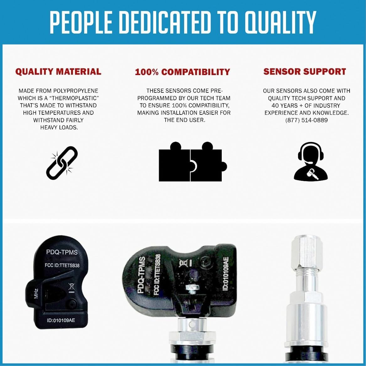 • PDQ tire pressure sensors are manufactured to exacting OE standards to ensure reliable performance and durability, it is constructed of high quality material, premium chip and durable lithium battery, every component has undergone extensive professional testing—including signal, operational temperature, thermal shock, humidity, and proof pressure to ensure trouble-free installation and excellent performance.