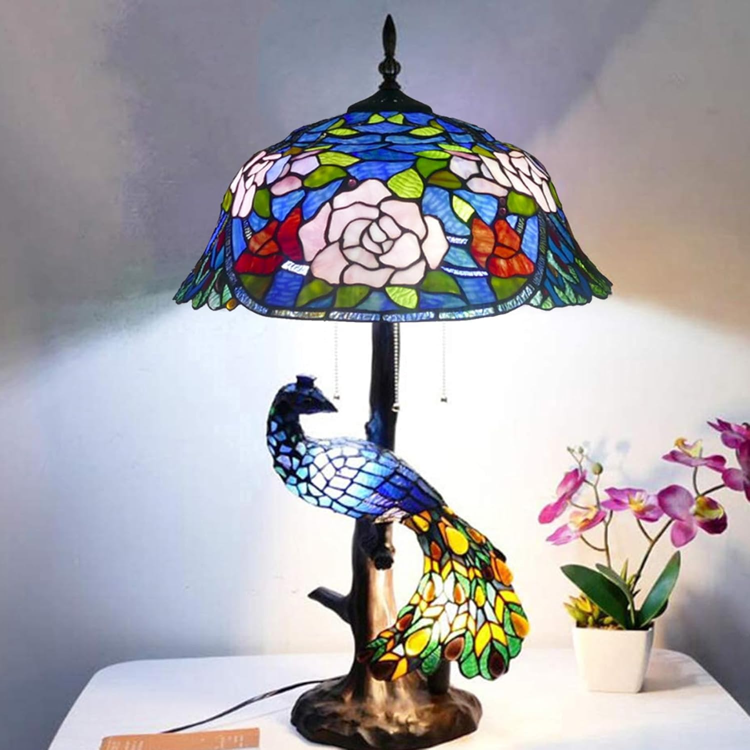★ Description: Large Tiffany Style Stained Glass Peacock Table Lamp Rose Grape Victoria Desk Light★ Shade Material: Stained Glass Process: handmade Shade size: W: 18 inch (46cm), H: 9 inch (22-24cm). ★ Lamp Base Material: Resin. stable, sturdy, Never rusts. Base size: H: 31 inch (78cm), W: 9 inch (22cm)★Light source requirement: E26/E27*3 and E12/E14x2 Light source type: incandescent lamps; energy-saving lamps; LED Light. (No included Light source ). The Light source required is screw fitting. ★Table Lamp Appropriate Style: European, American, Classical, Modern Suitable for: bedroom, living room, office, study, library, bank, museum, school, study rooms, nursery, kindergarten, Bedside table,Bedside,Kitchen wall corner, Desk side, desk, coffee bar,anywhere you want.