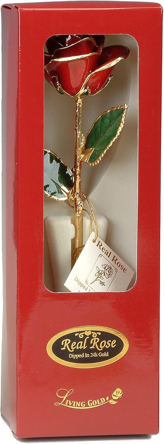 This is a real rose (12") preserved in lacquer and trimmed in 24K gold. Each flower is picked fresh at the peak of its beauty, formed and crafted by hand (to remove thorns, extra leaves, petals, etc.), and electroplated with a secret technique. You can still see the veins in the petals and leaves. It takes 3-6 months and more than 50 steps to complete one piece, making each one unique and meaningful. The rose comes in a beautiful red box and is the perfect way to show your everlasting love for your significant other. As part of the Birth Color Rose collection, this Pearl White Rose represents the month of April. It's a great gift for Valentine's Day, Mother's Day, birthdays, anniversaries, and other special occasions.