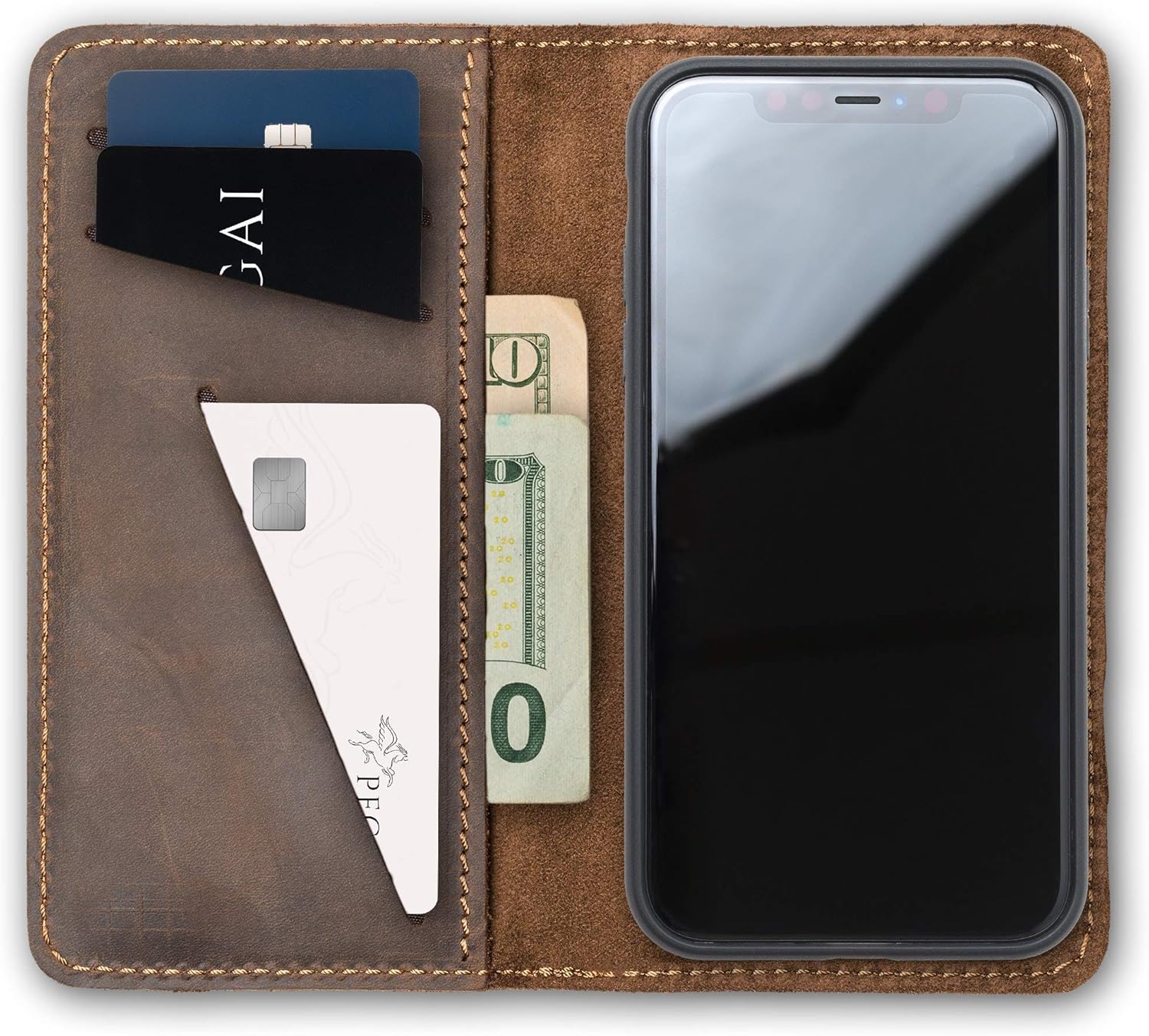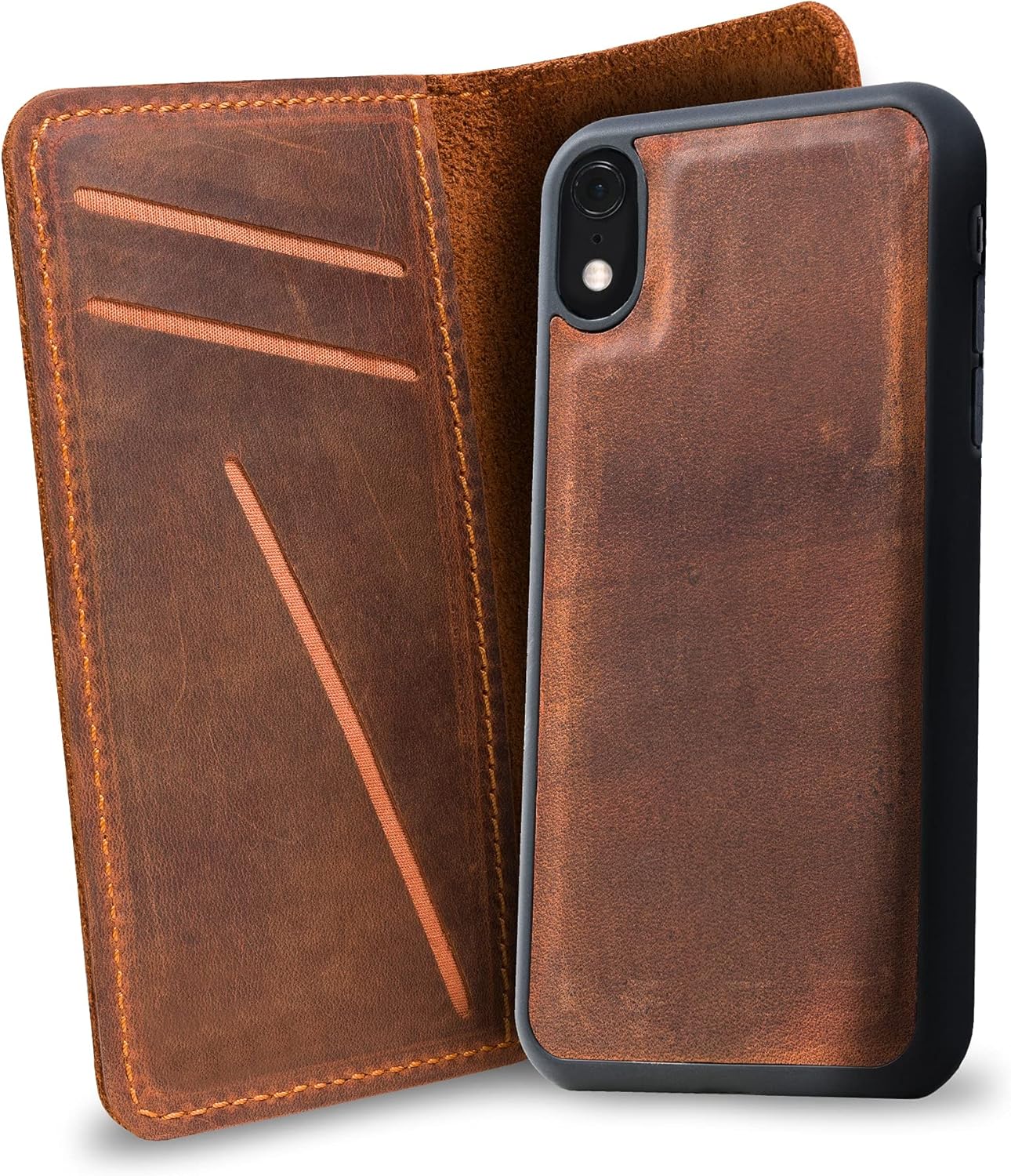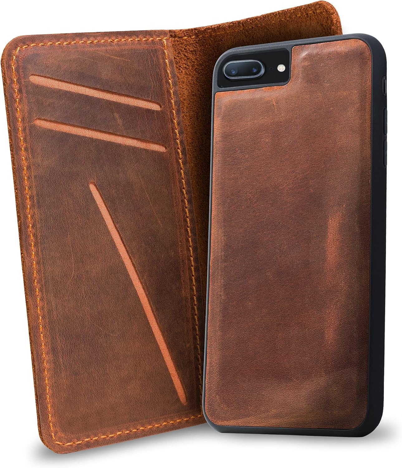 • DURABLE AND UNIQUE: Handcrafted from full-grain distressed leather, each iPhone case is unique with natural grain patterns. This wallet phone case is designed to last and fits your iPhone series and more.