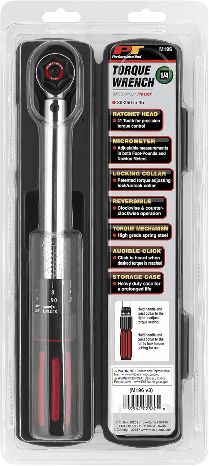 | Included Components | Performance Tool M196 1/4-inch Drive Click Torque Wrench, Black/Red, 30-250 in/lb |