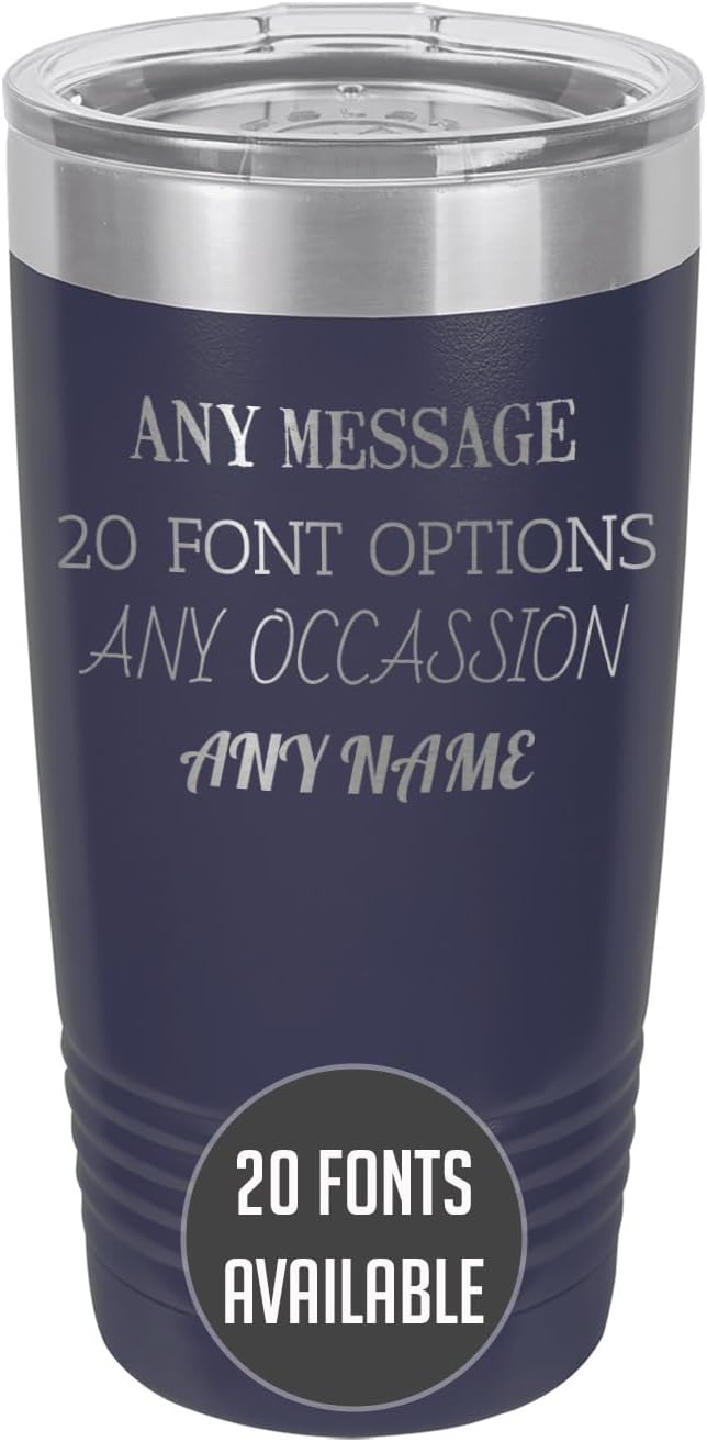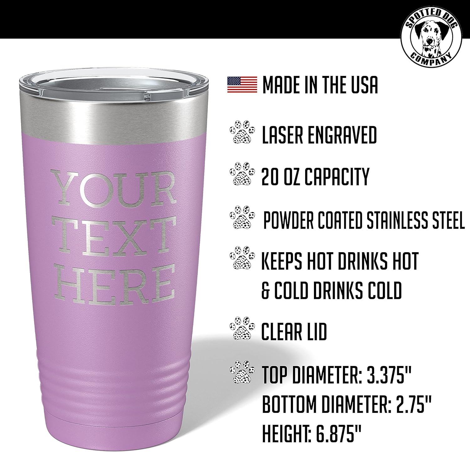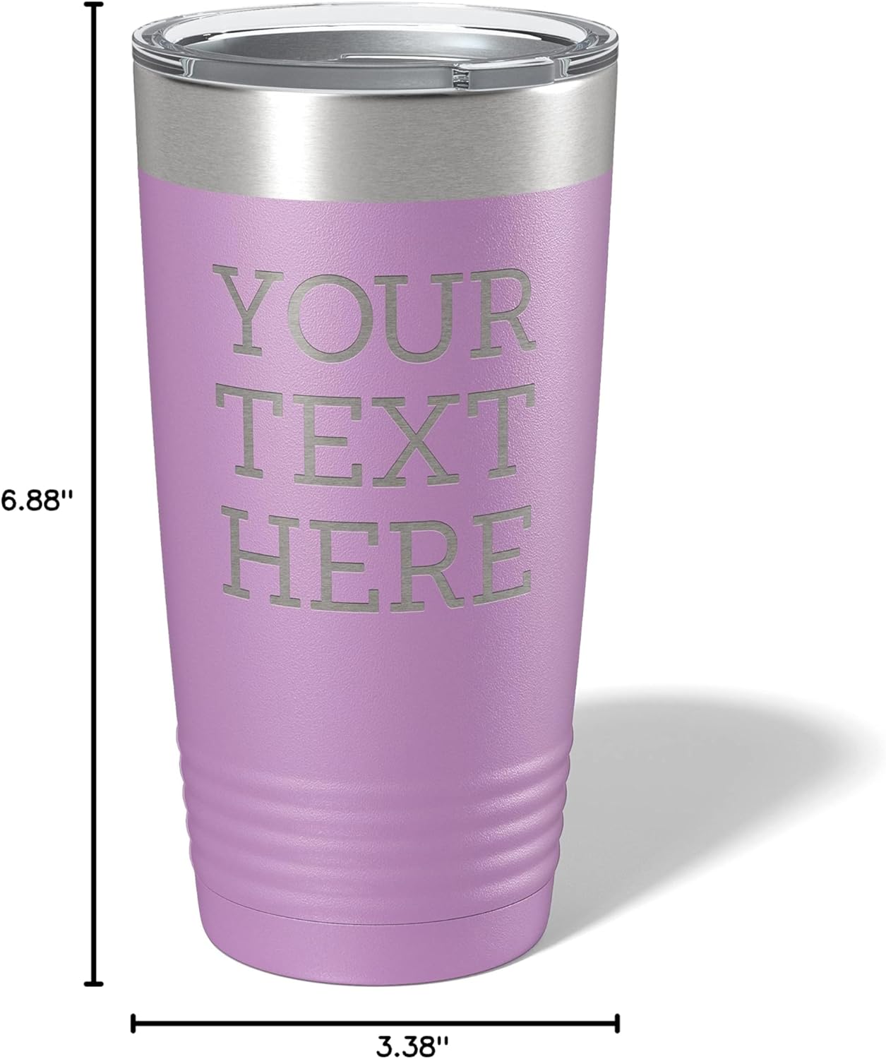 Item SpecsHeight: 6.875 inchesTop Diameter: 3.375 inchesBottom Diameter: 2.75 inchesCapacity: 20 ouncesLIGHT PURPLE TUMBLER – This powder coated stainless steel tumbler is the perfect gift for any occasion.Permanent engraving cuts your custom text through the color to reveal the stainless steel below; creating a design to be enjoyed for years to come.This tumbler is made of Premium 304 18/8 food grade stainless steel. Making them durable and great for regular daily use with any beverage including water, soft drinks, and tea.This tumbler features double-wall vacuum insulation with a clear lid. This helps the tumbler be 2X cold & heat resistant compared to other tumblers. Designed and etched in Fayetteville, Arkansas. Rest assured your gift will be classy, sturdy, and handmade to last a lifetime.Endless Enjoyment!- Makes a perfect birthday gift or party favor - A wonderful keepsake for any special occasion or anniversary- A unique personalized gift for a son, daughter, sister, brother, father, or mother- Backside optional text | Share your own message on the back of the glass for an additional charge (click Customize Now for options)