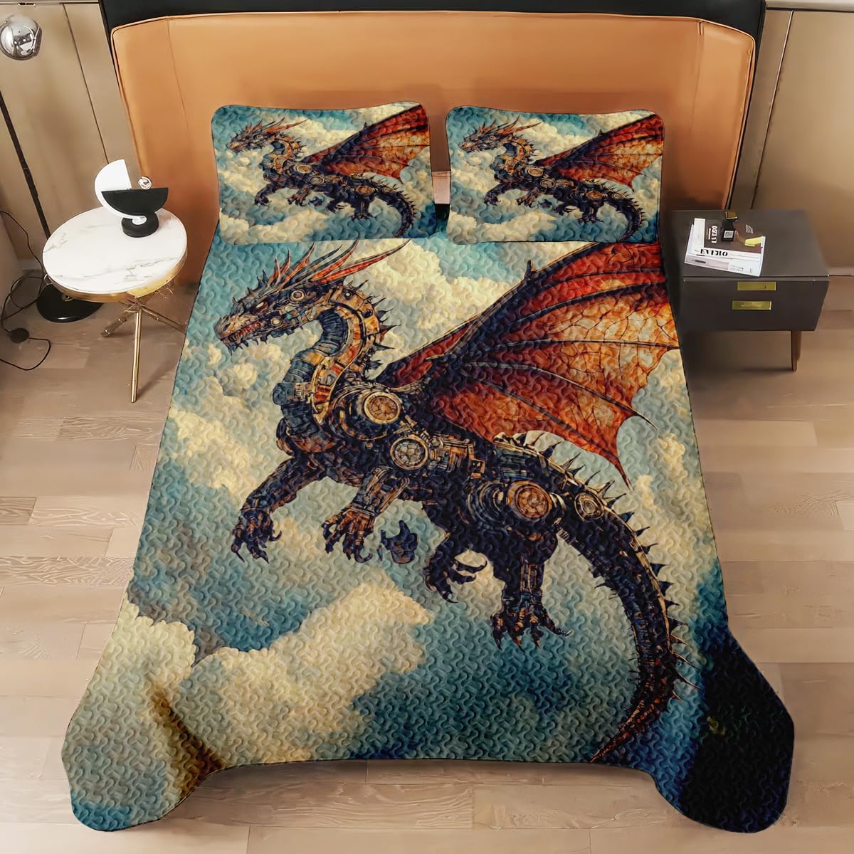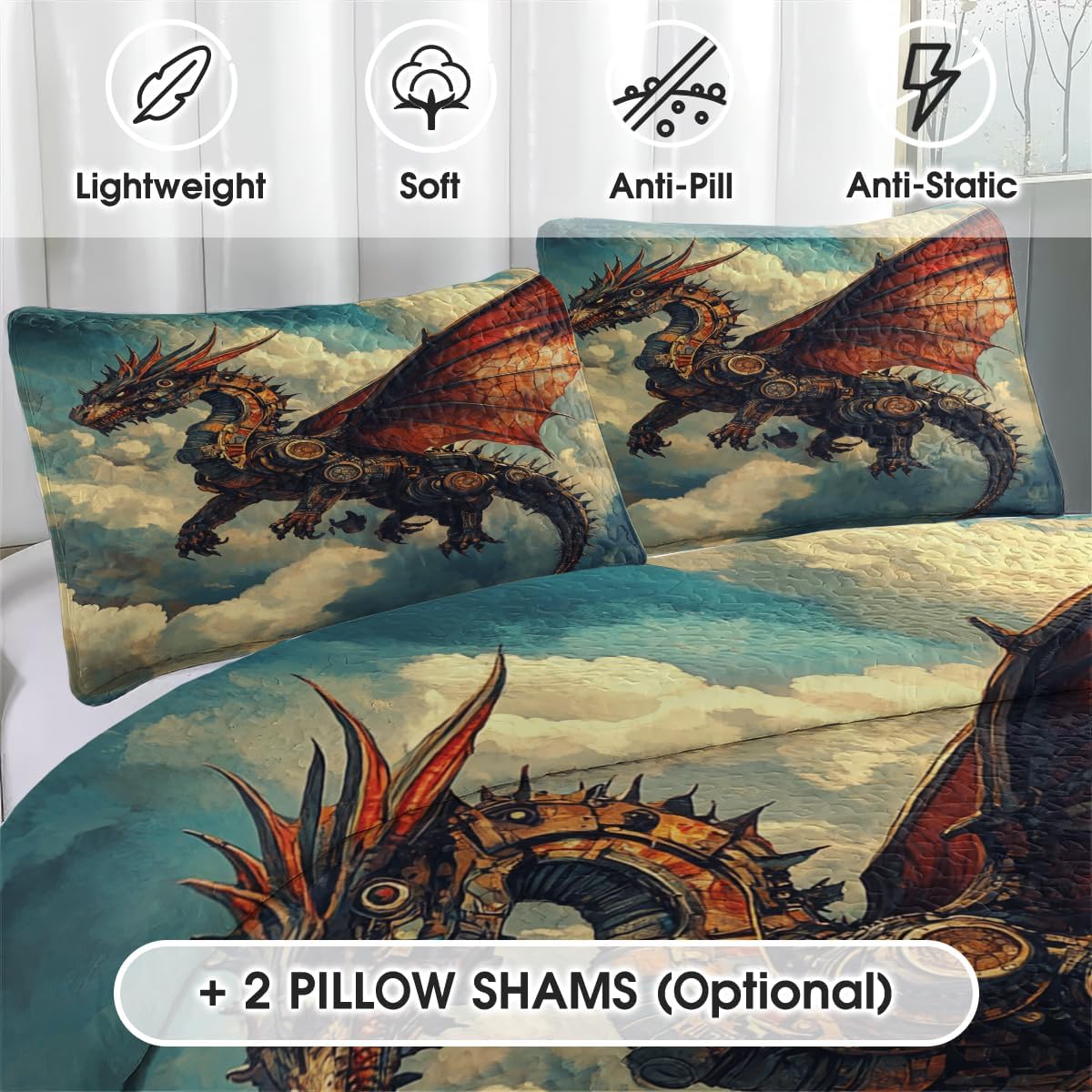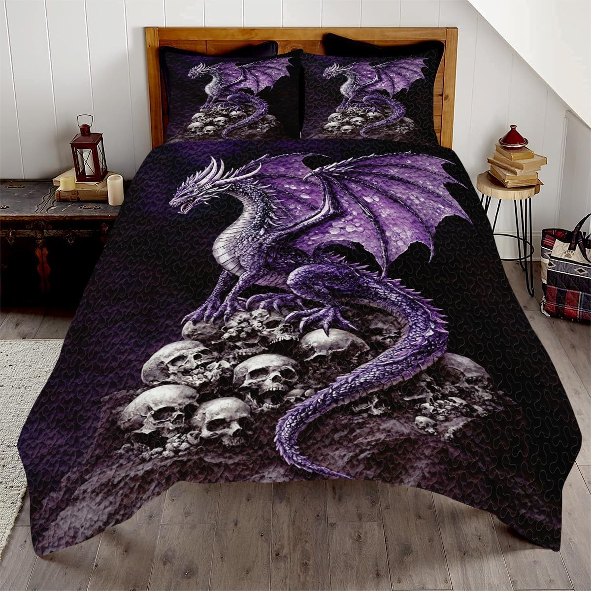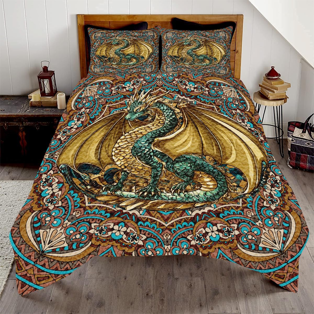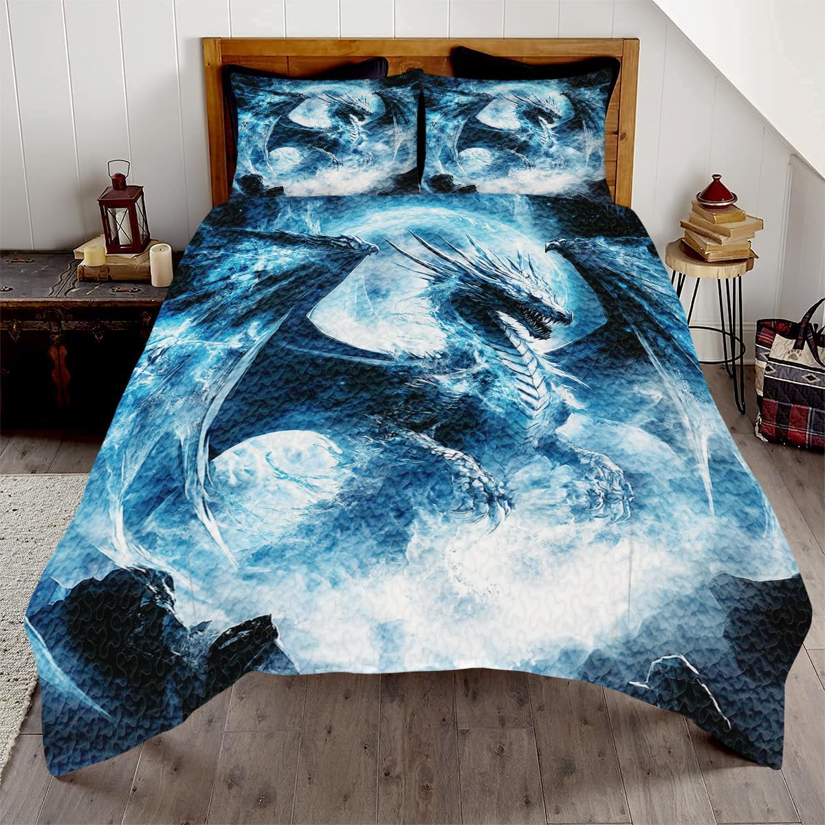 ATTENTION DRAGON ENTHUSIASTS: Fairy tales aren’t just for children. Envelop your bed in the magical allure of a vibrant dragon quilt set, letting your imagination soar in your dreams.★★★ WHY WAIT? CHOOSE YOURS TODAY!!! ★★★SIZE GUIDE / WEIGHT:Throw: 60x70 inches / 1.3 kgTwin: 70x80 inches / 1.4 kgQueen: 80x90 inches / 1.8 kgKing: 91x102 inches / 2.2 kgKEY FEATURES:Top-Quality Material: Crafted from a soft fabric blend of 30% cotton and 70% polyester, this premium microfiber quilt offers outstanding comfort and breathability for a delightful sleeping experience.Vivid 3D Design: Featuring bright colors and intricate patterns, this eye-catching set includes bedspread and pillow shams with printed designs on the front side only.Customer Satisfaction Guarantee: If you encounter any issues, simply contact us through the email provided with your product for a replacement or refund. We are committed to offering the best products and customer service on Amazon.Care Instructions: Machine wash separately in cold water, gentle cycle. Tumble dry on low heat and avoid using bleach.Perfect Gift Idea: Searching for the perfect surprise gift? This luxurious quilt makes an ideal present for Christmas or any special occasion. Its excellent heat regulation keeps you warm and comfortable all year long! The velvet bedding prevents overheating in the summer while keeping you cozy during the winter.Please Note: Manual measurements may vary by 2-3%.★★★ Click "Customize Now" at the top to start your unique experience and discover more quilt designs.