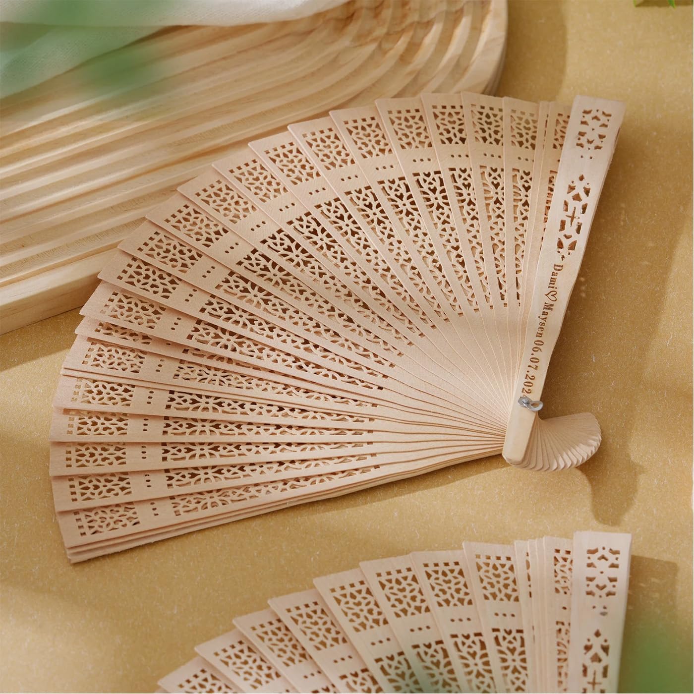 Material. Size: 20.5 cm long, 33 cm wide Packing: 20pcs/50pcs/100pcs in white organza bags. We can also engrave the name and date Material: These fans are made of wood, this hardwood has a natural fragrance and is the ideal material for making fans. Color: Natural wood color. Fans are made of natural wood and usually have color variations. It is normal for the same fan to show different colors. Good wood scent. Wooden folding fans have a light, pleasant scent that is not too strong for sensitive noses. Practicality and artistry: This is a handicraft with a vintage character. This classical style fan not only represents the elegance of classic beauty, but also keeps you cool in summer and decorates your home and office. These fans will give you a fresh and elegant feeling. Wide application: Wooden collapsible fans are suitable for home, office, tea house and stage, also can be used as a gift for your family or friends, add chic to party favors at weddings, birthdays, baby shower, bridal shower, graduation or any outdoor or indoor events, your guests will love it.
