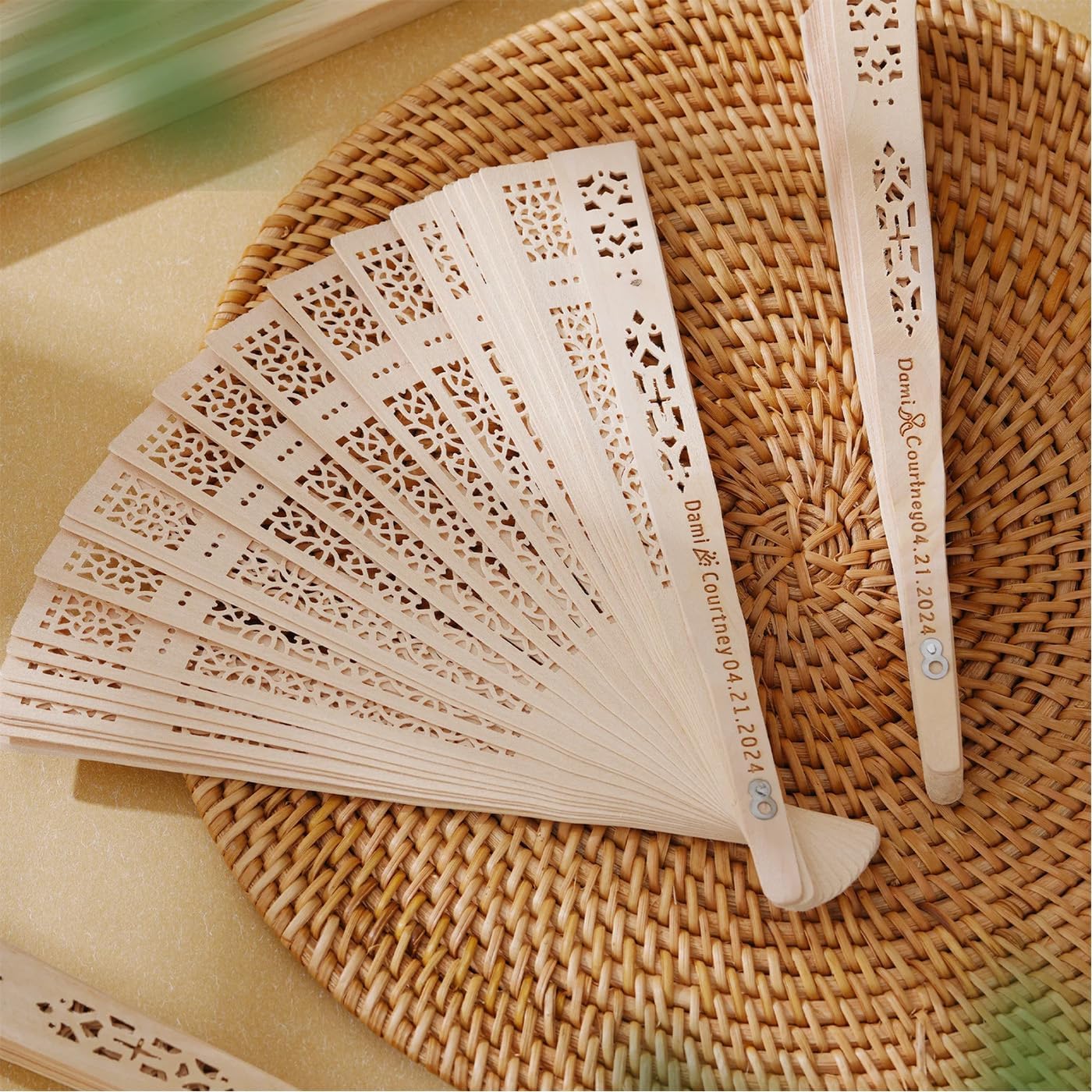 • personalized fans for wedding favors: These fans are made of wood, a hardwood with a natural scent that is ideal for making fans. Color: Natural wood color. Fans are made of natural wood and usually have color differences. It is normal for the same fan to show different colors. Good wood scent. Wooden folding fans have a light, pleasant scent that is not too strong for sensitive noses.