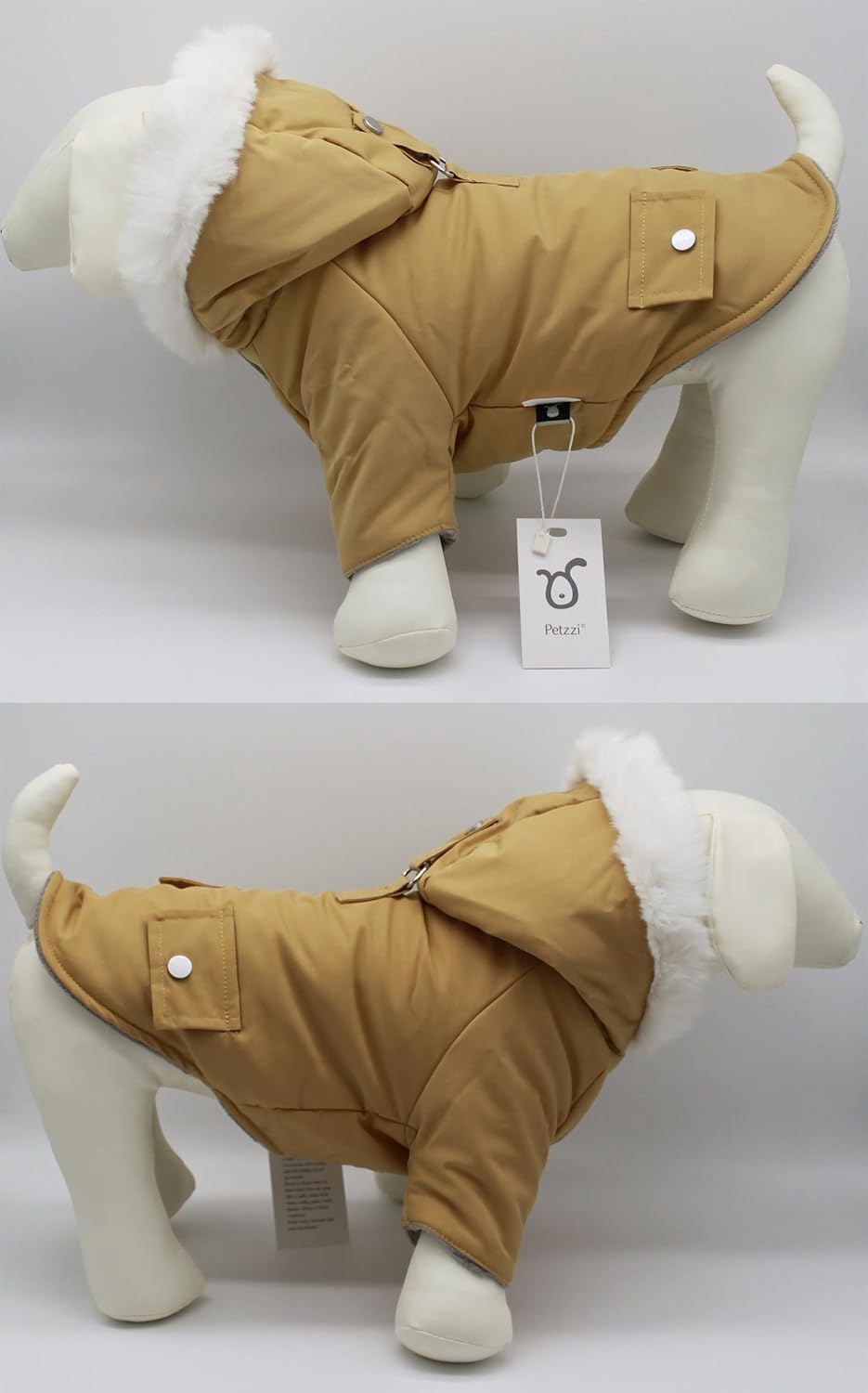Introducing the Petzzi Pet Dog Puppy Cat Winter Insulated Padded Coat Jacket - Alexander. The ultimate blend of warmth, style and comfort for your furry companion. This hooded jacket with faux fur trim is meticulously designed to provide unbeatable protection against chilly weather while ensuring your pet stays fashion-forward. Crafted with the high quality materials, this insulated coat boasts water-resistant features, making it ideal for outdoor adventures even in damp conditions. The faux fur trim adds a touch of elegance, creating a modern and chic look that's sure to turn heads during those frosty walks. The interior is lined with soft fleece, offering a cozy and snug fit to keep your pet toasty and comfortable. Whether it's a playful romp in the snow or a leisurely stroll, this jacket is tailored to keep your pet warm without compromising on style. Available in a range of sizes to suit dogs, puppies, and cats, the Petzzi Pet Coat is both functional and fashionable. Choose this jacket to ensure your pet not only stays warm but also makes a statement with its trendy design. Get ready to elevate your pet's winter wardrobe with this high-quality, insulated coat, providing both warmth and a touch of flair. Please refer to our size chart to find the perfect fit for your four-legged companion (Please SIZE UP if measurements fall between sizes). Model measures Neck Girth 11", Chest Girth 15", Back Length 11", and is wearing size S of Alexander Winter Coat. A blank white label at seam for putting down your dog's name and contact info.