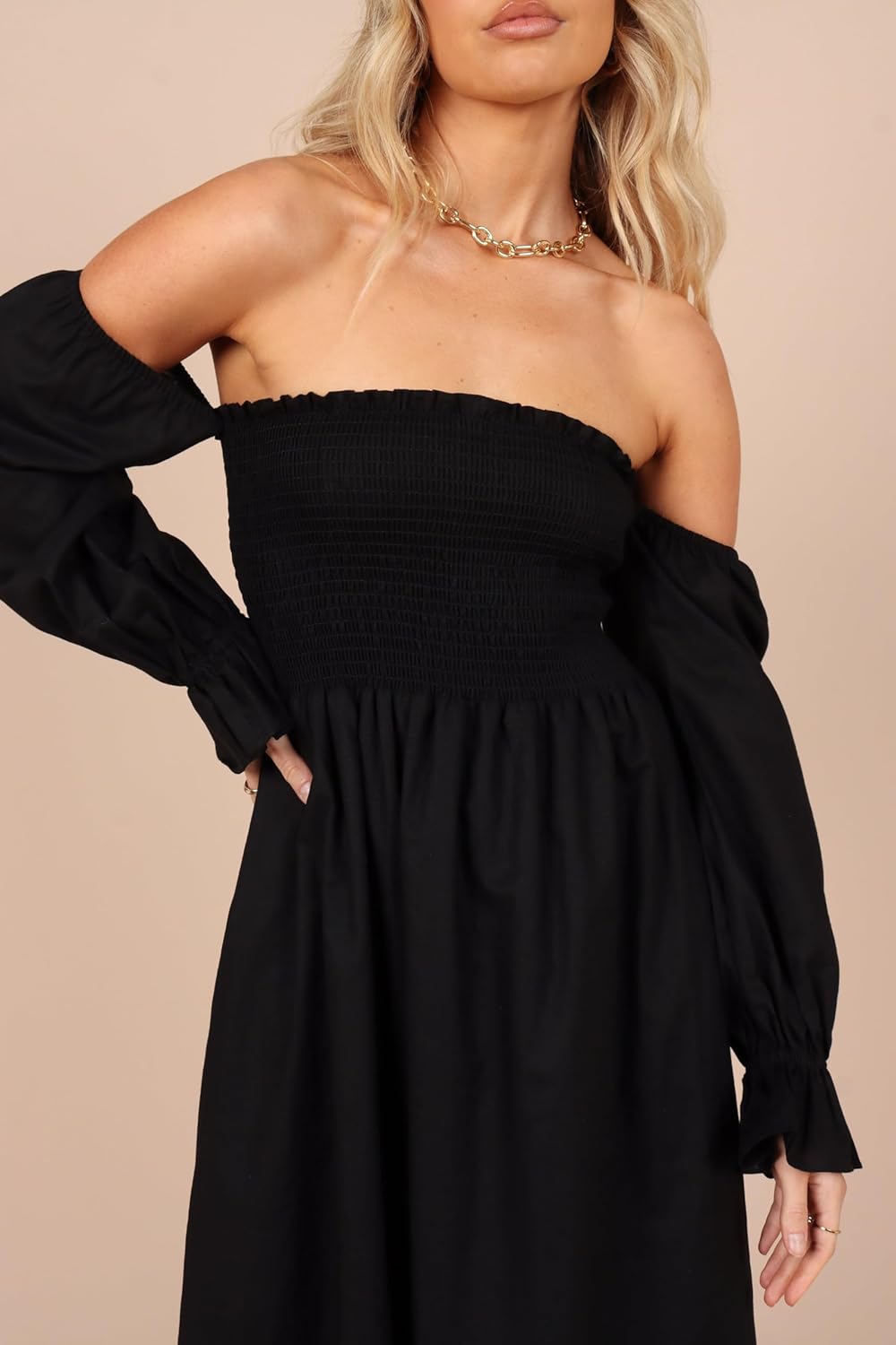 This off shoulder midi dress is an easy-to-wear piece that will keep you feeling feminine and elegant. The long sleeves feature elasticised shoulders, complete with a ruffle cuff for added charm. The shirred bodice ensures a comfortable fit, while the functional pockets provide extra convenience.