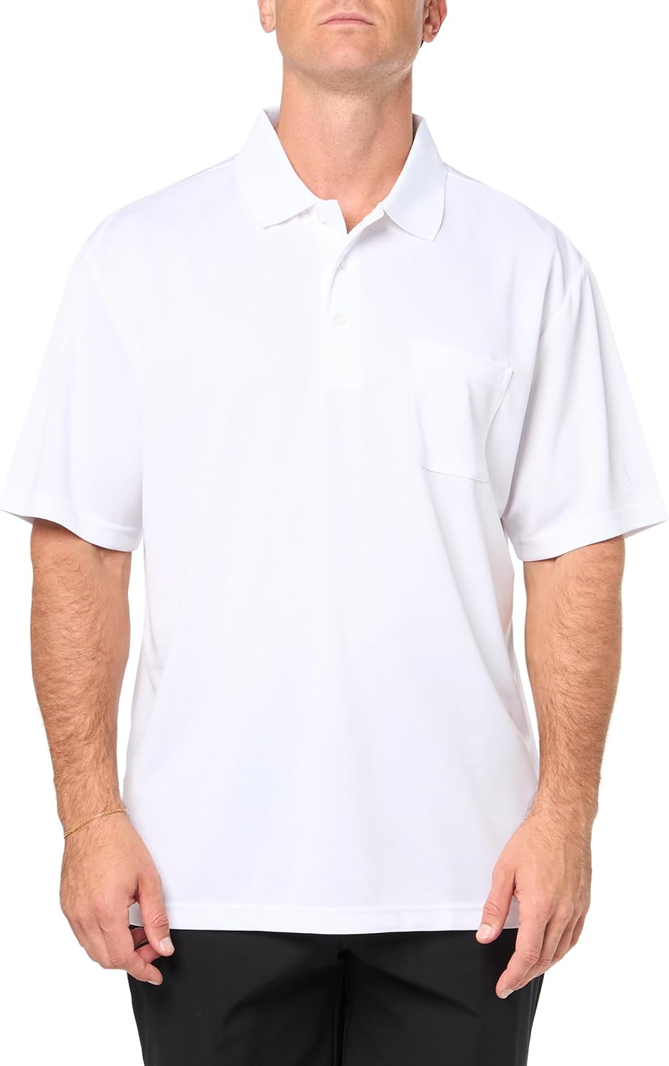 Stay comfortable and stylish throughout your golf game with our PGA TOUR Airflux solid mesh golf polo shirt with a pocket. Engineered for performance, this lightweight top is crafted from ventilated mesh fabric, ensuring breathability to keep you cool on hot days. Combining fashion and function, it features moisture-wicking technology to keep you dry and fresh, while built-in UPF 50 sun protection shields you from harmful UV rays. Offered in big and tall sizes, ensuring comfortable coverage and unrestricted movement for all body types. Easy to pair with other PGA TOUR golf apparel, our performance polo shirts for men are perfect for enduring comfort and impeccable style on the course and beyond.