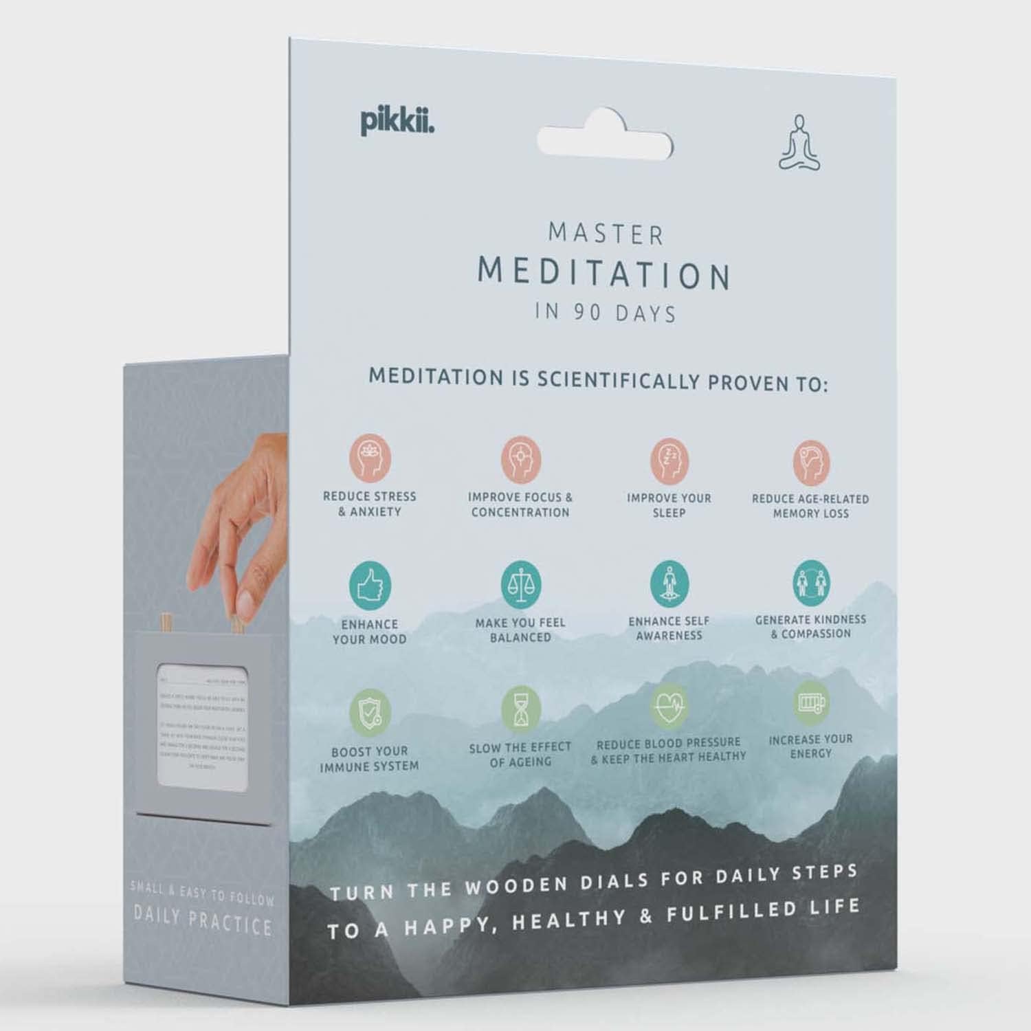 Unlock the power of meditation with this clever little scroll box. This step-by-step guide will take you on a gentle 90 day journey to learn the practice of meditation and enhance your wellbeing. Across simple and easy to follow challenges, tips and resources, you will begin to feel the proven life-changing benefits, including stress reduction, increased energy and an enhanced mood. Turn the wooden dials to scroll through each step and build a consistent practice that can totally transform your life.