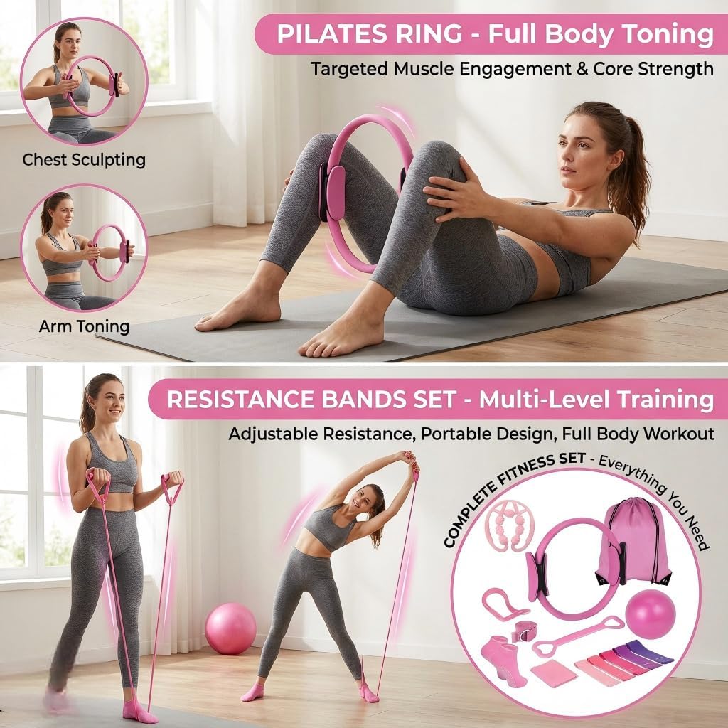 Create your own studio-quality workout with this pilates accessories for women set, specially designed for effective at home pilates workouts. This versatile at home pilates kit includes essential tools such as a pilates ball and ring set, resistance accessories, and stretching equipment to support full-body training.Whether you’re just starting your pilates journey or looking to elevate your routine, this pilates kit for home workouts women helps improve core strength, posture, flexibility, and muscle control. The carefully selected accessories provide controlled resistance and comfort, making workouts safe and enjoyable for all fitness levels.Compact and portable, this pilates home workout kit fits perfectly into your daily routine at home, in the gym, or while traveling. A practical and thoughtful choice, this pilates essentials kit for women is ideal for anyone looking to stay active, toned, and balanced from the comfort of home.