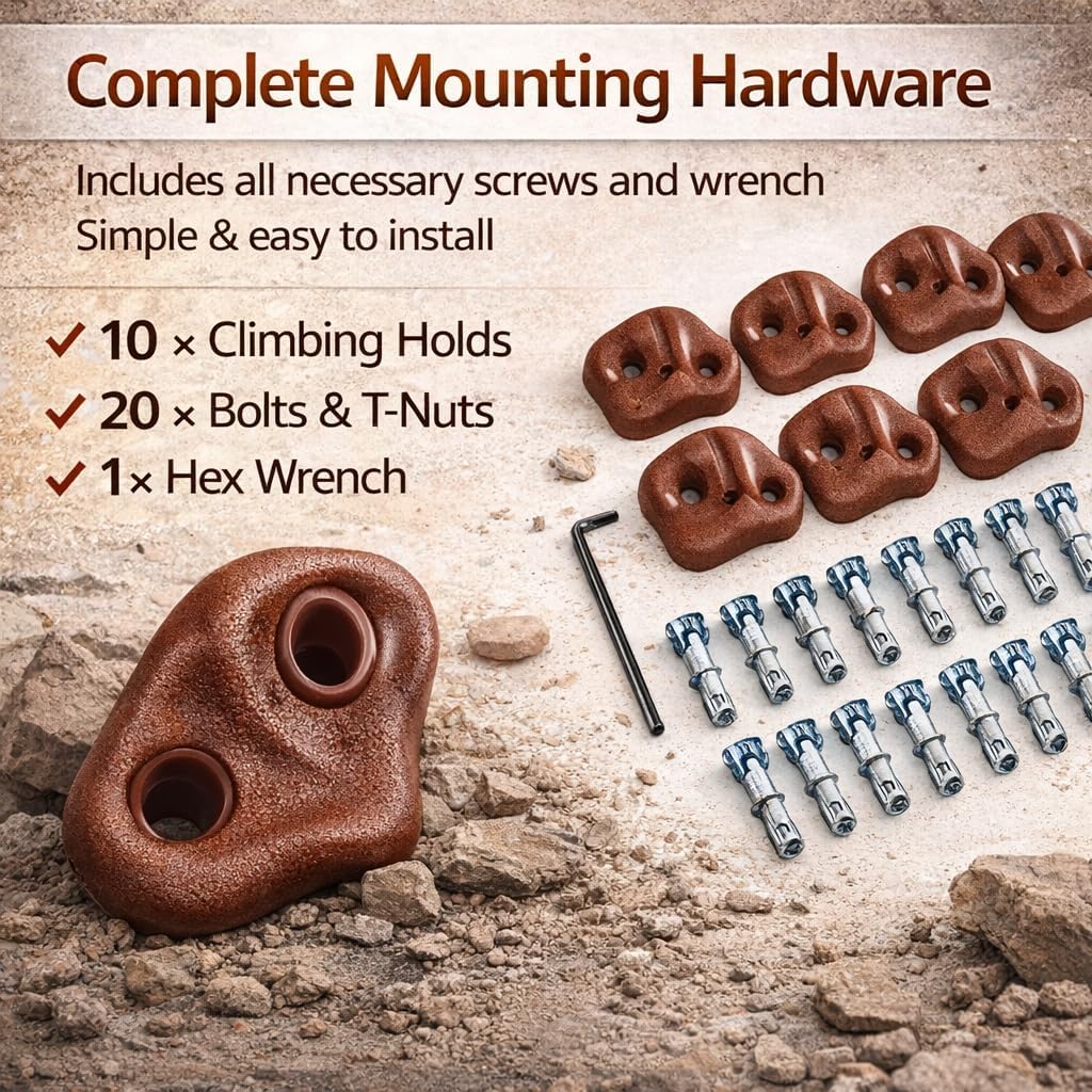 [PREMIUM MATERIAL] Crafted from premium PE material, these rock climbing holds are built to last. They are odorless, , and highly abrasion-proof, ensuring durability even with frequent use. The sturdy construction means they won’t crack or break easily, making them a reliable choice for both indoor and outdoor climbing walls.[ERGONOMIC COMFORT] Designed with ergonomic contours and realistic rock textures, these climbing holds offer a comfortable and secure grip. The thoughtful shape reduces hand fatigue while enhancing safety during climbs. Whether for kids or adults, they provide a feel that mimics real rock surfaces for an authentic climbing experience.[EASY INSTALLATION] This set includes everything you need for hassle- setup: 10 climbing holds, 20 high-strength screws, and an L-shape hex wrench. The professional-grade hardware ensures a secure and stable installation. You can quickly mount them on any climbing wall, saving time and effort while guaranteeing a sturdy hold.[FUN AND FITNESS] for developing strength and courage, these climbing holds exercise enjoyable for kids and adults alike. Rock climbing is a low-impact, full-body workout that improves coordination and endurance. Unlike high-intensity sports, it focuses on controlled movements, making it ideal for building muscle and mental resilience.[SAFETY FIRST] Safety is paramount, especially for young climbers. These holds are designed for supervised use, and we recommend adding cushioning pads at the base for higher installations. The weight limit of 80kg ensures stability, while the textured surface minimizes slipping. Always ensure proper adult supervision for a safe and fun climbing session.Spec:Item Type: Rock Climbing HoldsMaterial: PEWeight Limit: Approx. 80kg / 176.4lbAge Limit: 3 Years Old And AboveProduct Size: Approx. 12.5x10cm / 4.9x3.9inPackage List:10 x Rock Climbing Holds20 x Screw1 x L Shape