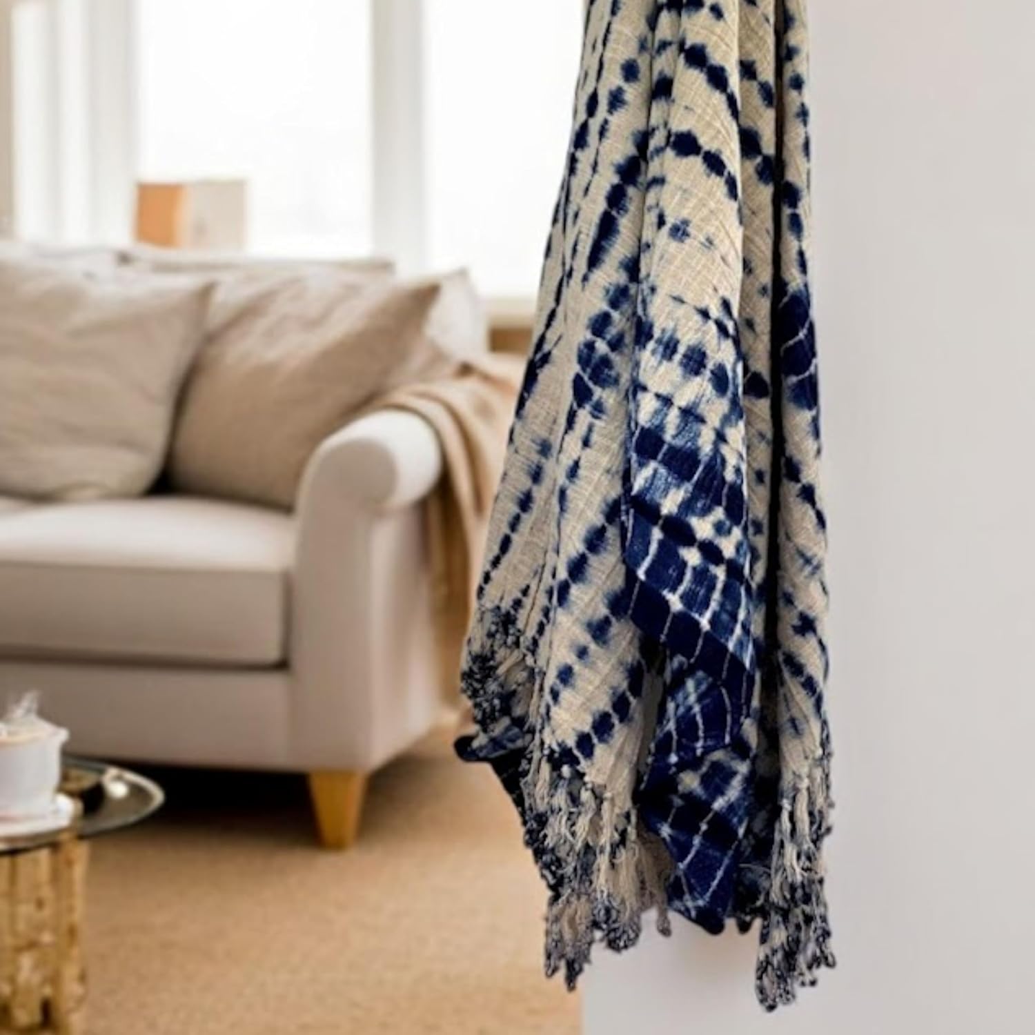 Indigo Shibori Throw, handcrafted using the traditional Japanese tie-dye technique. Each throw is a unique work of art, with intricate, hand-dyed patterns in stunning indigo hues that bring a sense of calm and creativity to any space. Made from soft, breathable cotton, this throw is lightweight yet cozy, perfect for year-round use. Whether draped over your couch, bed, or used outdoors, it’s versatile enough to enhance your living room, bedroom, or patio with effortless style. The Shibori design adds a bold, artistic flair to your home decor, creating a striking focal point wherever it’s placed. This throw also makes a thoughtful gift for anyone who appreciates handmade textiles and unique designs. It’s easy to care for, as it’s machine washable and retains its vibrant color and softness with each wash. Whether you’re cozying up on a cool evening or adding an eye-catching accent to your home, this Indigo Shibori Throw is the perfect blend of function, comfort, and artistry. Embrace the beauty of traditional craftsmanship with a modern twist for a piece that will last for years to come.