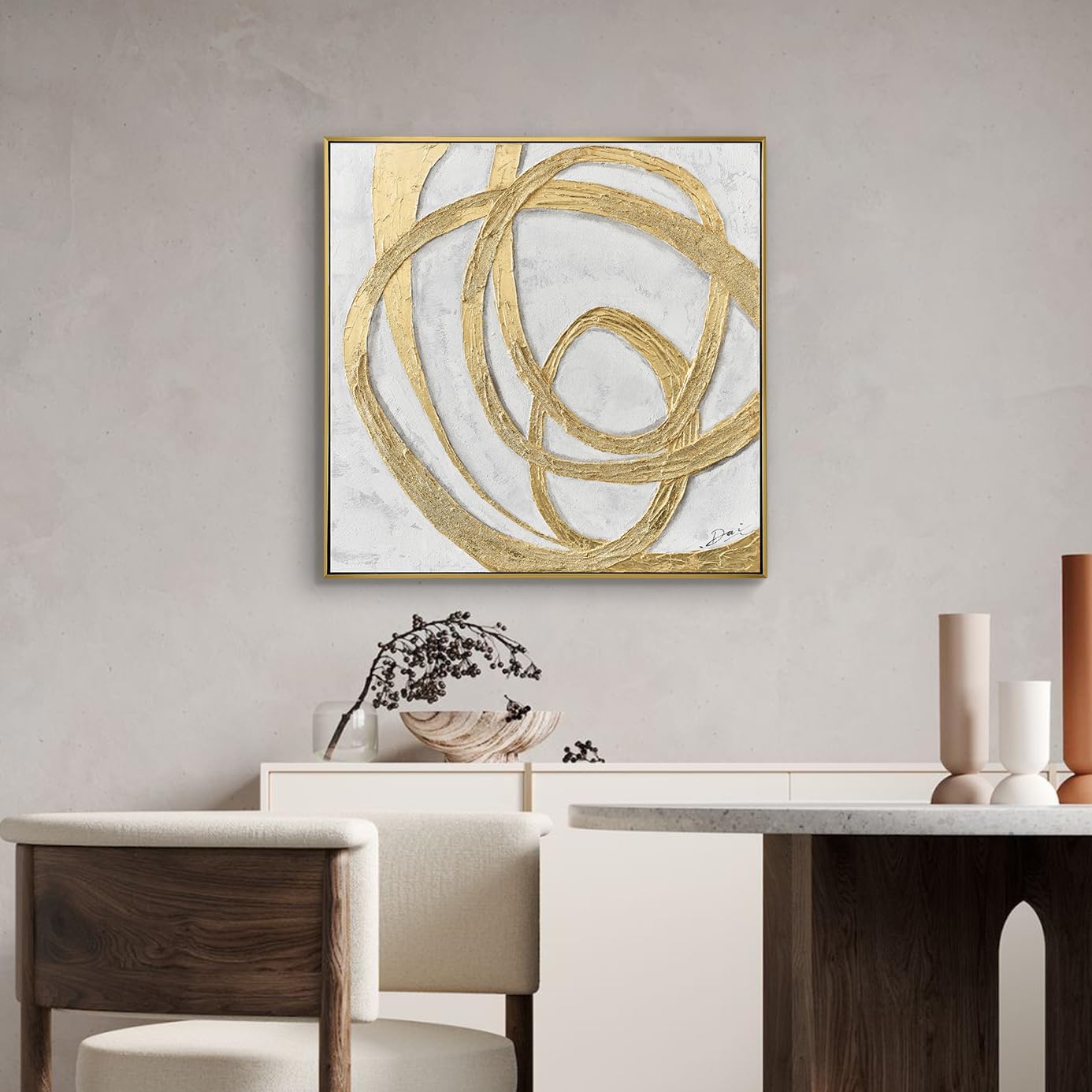 Transform your space with this stunning 32 x 32-inch abstract wall art that masterfully combines elegance and modern design. The piece features dynamic golden swirls artfully rendered against a serene white background, creating a sophisticated focal point for any room. The textured brushwork adds depth and dimension, while the metallic gold accents catch and reflect light throughout the day, bringing movement and energy to your walls. Professionally framed in a complementary gold-finished frame, this canvas artwork arrives ready to hang with all necessary mounting hardware included. The versatile neutral palette makes it perfect for contemporary living rooms, bedrooms, offices, or hallways. Its landscape orientation and generous size command attention while maintaining a refined aesthetic that works beautifully as either a standalone statement piece or as part of a curated gallery wall. The durable construction features quality canvas wrapped over a sturdy frame, ensuring this elegant piece will continue to make a sophisticated statement in your space for years to come. The matte finish and rustic touches add character while keeping the overall look timeless and adaptable to various decor styles.