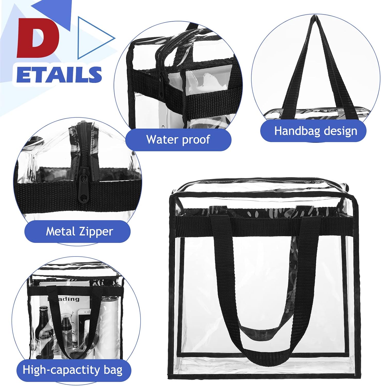 • Perfect Size for Stadium Events & Daily NeedsMeasuring approximately 12 x 6 x 6 inches (30 x 15 x 15 cm),these clear tote bags for women are perfectly sized to meet most stadium security requirements.Spacious enough to hold all your essentials-cameras,water cups,mobile phones,keys,ID cards,sun hats,sunglasses,and snacks-this clear stadium bag is designed with convenient handles for easy carrying.Whether you’re heading to a game or running errands