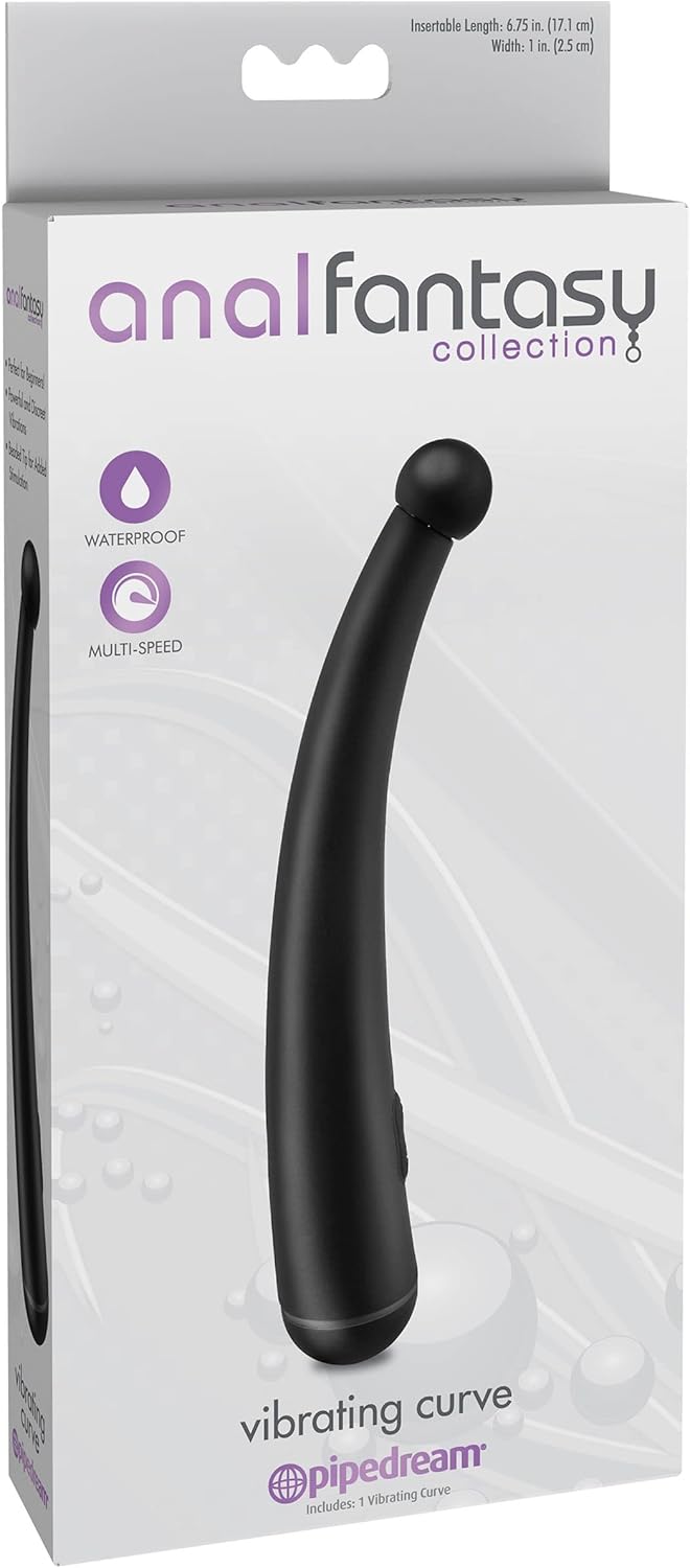 ANAL FANTASY VIBRATING CURVE. Si nunca has probado el juego anal, el Vibrating Curve es justo lo que necesitas para explorar el maravilloso mundo de la estimulación anal. El Vibrating Curve cuenta con un eje curvado y punta redondeada para la estimulación del Punto-P, mientras que el motor silencioso ofrece vibraciones alucinantes directamente a tu área más sensible. Para encender y apagar el vibrador, solamente debes girar el dial ubicado en la base, con el que podrás controlar la intensidad de la vibración. La limpieza es una obligación después de la diversión con el Pipedream toy Cleaner y agua tibia. Alcanzar el orgasmo mediante la estimulación anal es increíblemente excitante gracias a la alta concentración de terminaciones nerviosas y nuestra Anal Fantasy Collection que incluye juguetes que estimulan a cada uno de esos nervios. Así que permítete entrar en un nuevo mundo del placer por la puerta trasera... las posibilidades son infinitas! Longitud insertable: 17,6 cm. Diámetro máximo: 2,8 cm. Incluye muestras diferentes a las ofertadas.