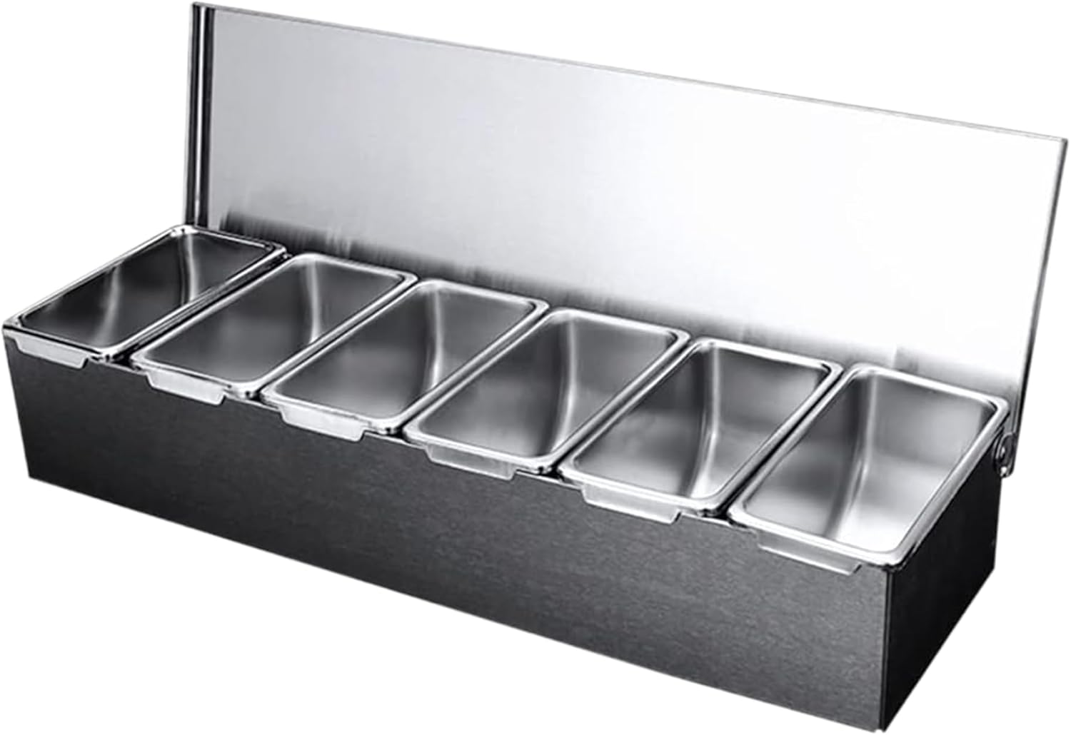 Description: The 6 Compartment Pizza Topping Station is a must-have for any pizza lover. With its organized compartments and stable stainless steel material, it keeps your pizza toppings fresh and easily accessible. The detachable design makes it easy to clean and maintain, ensuring your toppings stay fresh and hygienic. This pizza topping station is versatile and can be used to store and organize condiments, sauces, or other small items in your kitchen or restaurant. With a capacity of 600ml per compartment, it provides ample space to store all your favorite toppings. You can easily refill the compartments as needed, ensuring your toppings are always fresh and ready to use. Whether you're a home cook or a professional chef, this 6 Compartment Pizza Topping Station is a practical and convenient addition to your kitchen. Features:. Pizza Topping Station. -Color: Silver. -Material: Stainless Steel. -Size: about 45.5x8.9x14 cm/17.91x3.50x5.51 inch. -Capacity: 600ml/Each Compartment. Note: Manual measurement, please allow slight errors in size. The colors may exist slight difference due to different screens. Package Including 1 x Pizza Topping Station