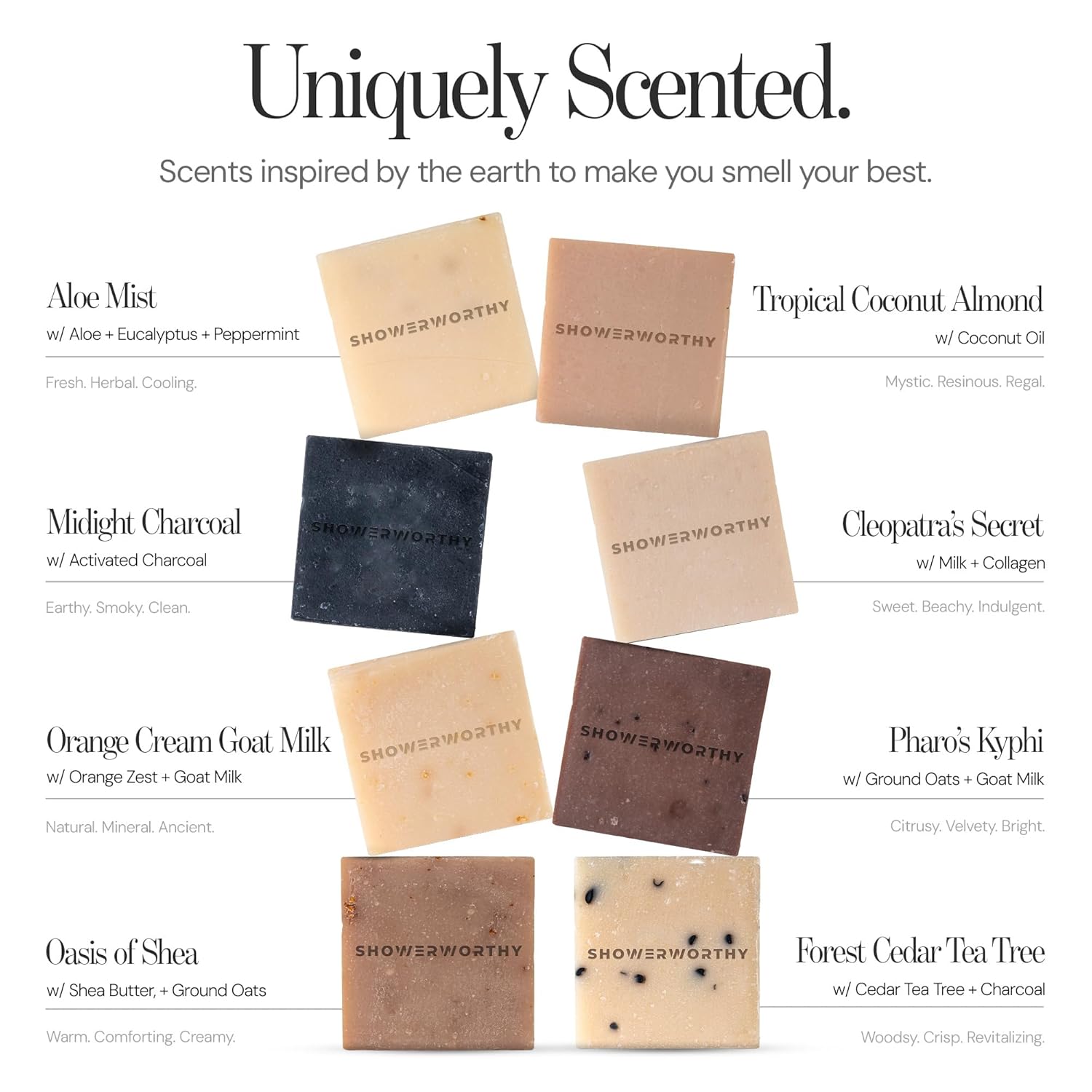 | Active Ingredients | Organic Shea Butter, Organic Coconut Oil, Organic Olive Oil, Activated Charcoal, Organic Sunflower Oil, Ground Oatmeal, Honey, Peppermint Leaves, Eucalyptus Oil, Tea Tree Oil, Sea Salt, Goat Milk, Essential Oils, Milk Powder, Collagen, Lavender buds, Distilled Water, Lye., tea_tree_oil |