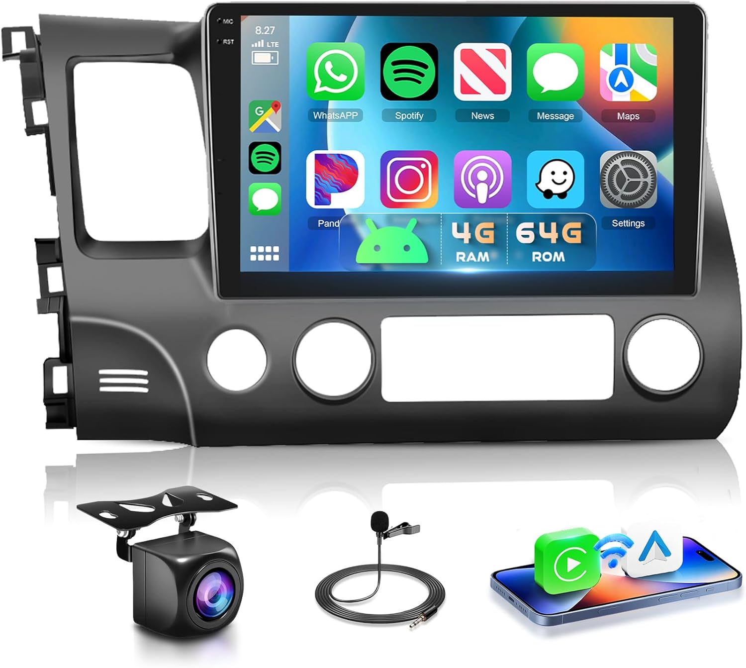 Podofo 4G+64G for Honda Civic 2006-2011 Car Stereo Radio 10.1 inch Android 15 Wireless Carplay Android Auto Touch Screen Bluetooth5.0 GPS Navigation WiFi 32-EQ FM/RDS Backup Camera