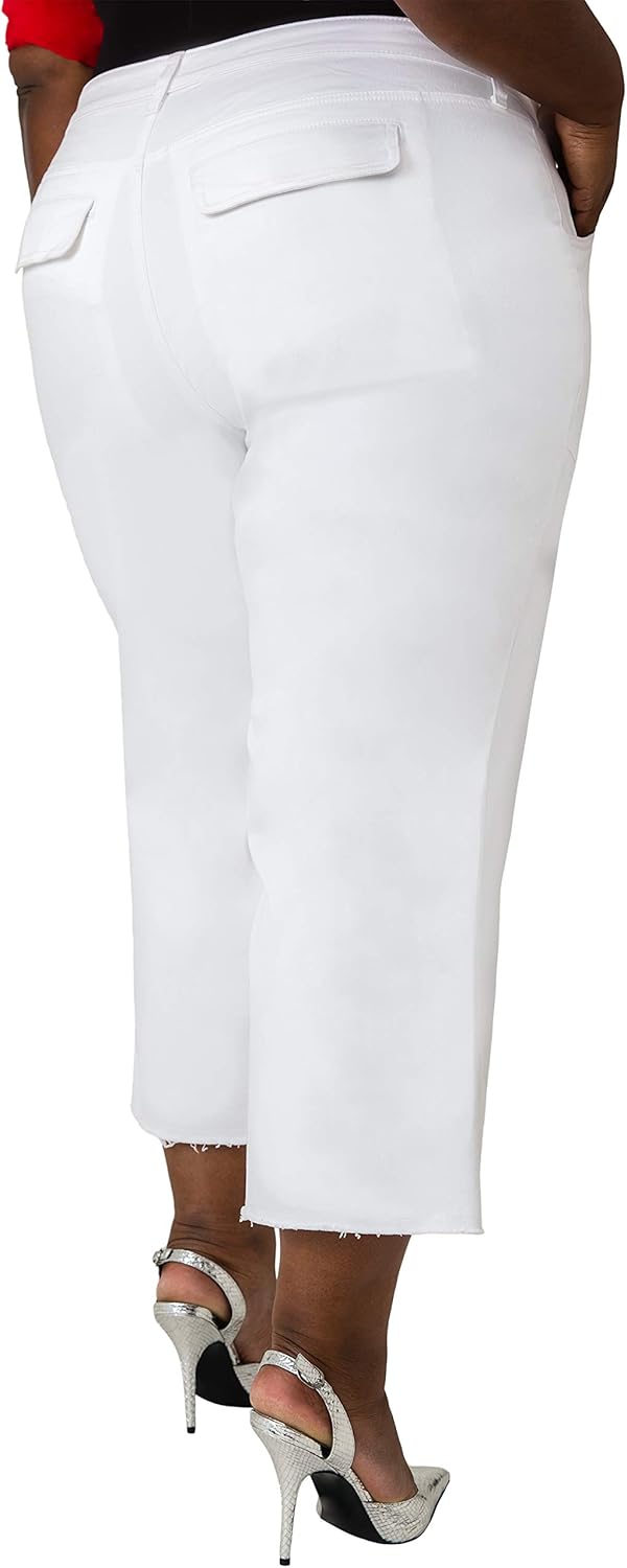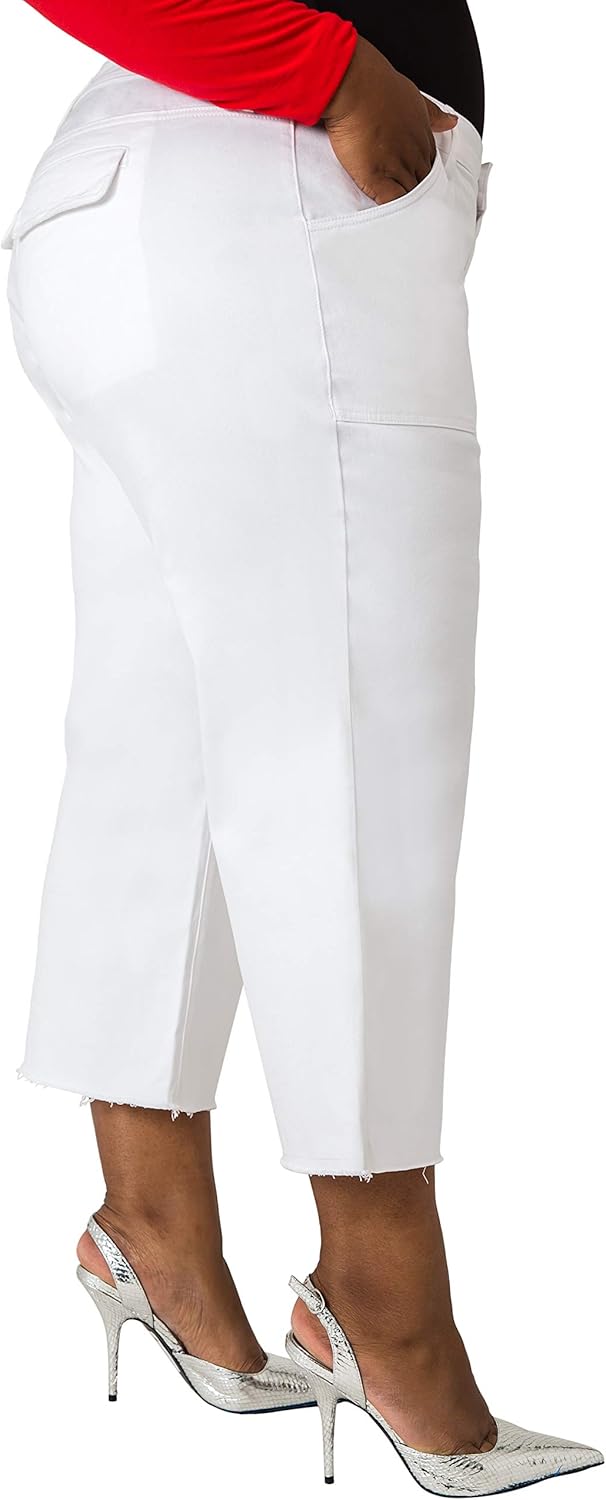 These cropped white wide leg jeans have a subtle raw frayed hem. They also feature front patch pockets for current aesthetic. Slightly high waisted, these curvy fit jeans are tailored to fit big hips, thighs, and butts. Made from exquisite stretch denim to accommodate your curves and provide superior stretch recovery.