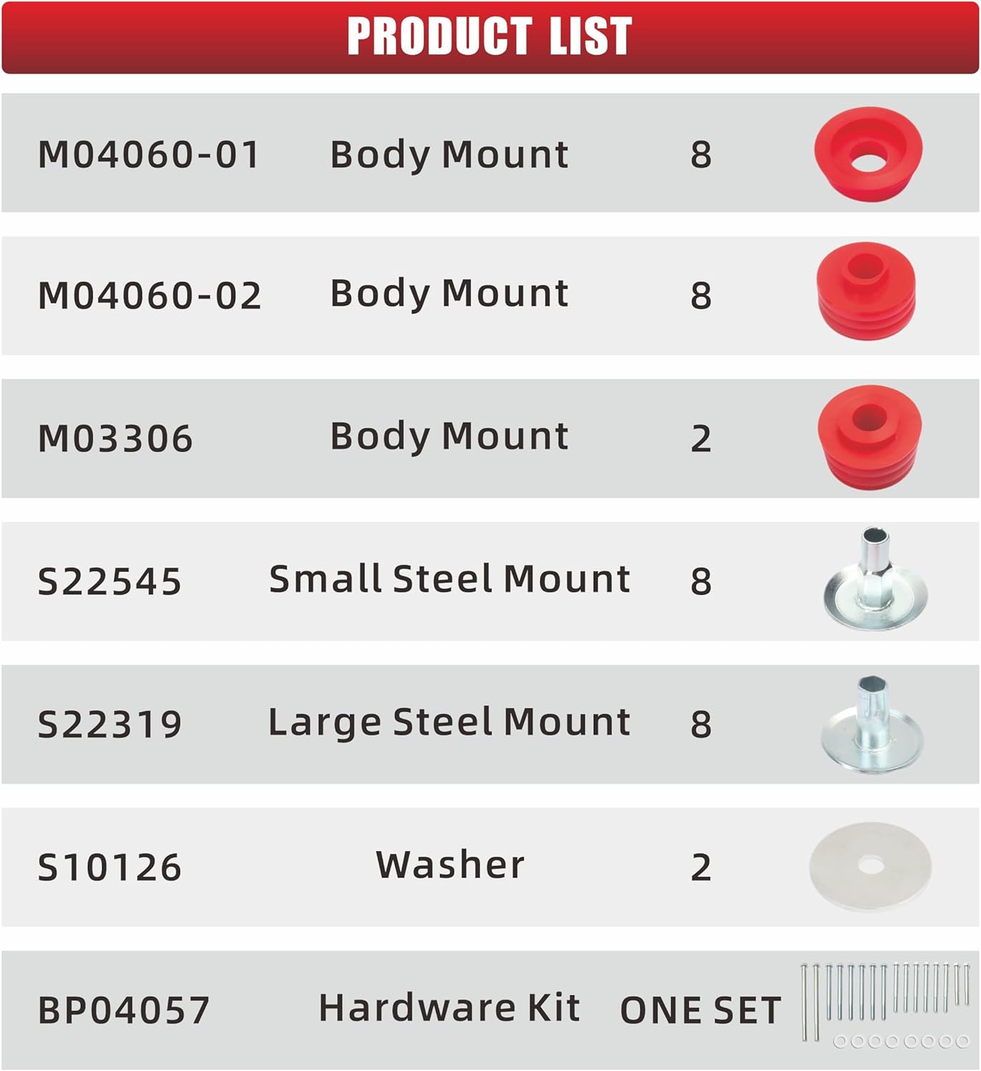 【Compatibility】 Compatible for F-250 F-350 Super Duty (Platinum)【2013-2016】& F-250 F-350 Ssuper Duty(Cabela's)【2009-2010】& F-250 F-350 Super Duty (King Ranch Lariat XL XLT)【2008-2016】& for F-250 F-350 Super Duty(Harley-Davidson Edition)【2008-2010】& F-250 F-350 Super Duty (FX4)【2008-2009】【Key Features】3D Locking Technology ensures precise cab-to-frame alignment, blocking 90% of road noise and vibrations. 60% reduced wear on critical components by absorbing high-frequency vibrations.Dynamic Cushioning System adapts to rough or smooth terrain for silky-smooth driving control. 40% improved cornering stability with reinforced body rigidity. 【Material】Core Material: Polyurethane blend Also included high quality plated steel + Double Anti-Corrosion Treatment . Key Advantage: 5x better aging resistance and 200% higher load capacity vs rubber mounts.Premium grade high-density special blend of polyurethane construction + Nano Anti-Permeability Coating resists oil dirt and extreme temperatures (-40°C to 120°C). Triples lifespan compared to OEM parts. 【Package Contents】8×Body Mounts (Part#M04060-01) | 8×Body Mounts (Part#M04060-02) | 2×Body Mounts (Part#M03306) | 8×Small Steel Mounts (Part#S22545) | 8×Large Steel Mounts (Part#S22319) | 2×Washers (Part#S10126) | A set of Hardware Kit (Part#BP04057).【Customer Assurance】Backed by our replacement & return policy and product warranty. our dedicated team of specialists is ready to assist you anytime. For the fastest resolution, simply contact us with your photos/video about problem for priority, 24-hour response.