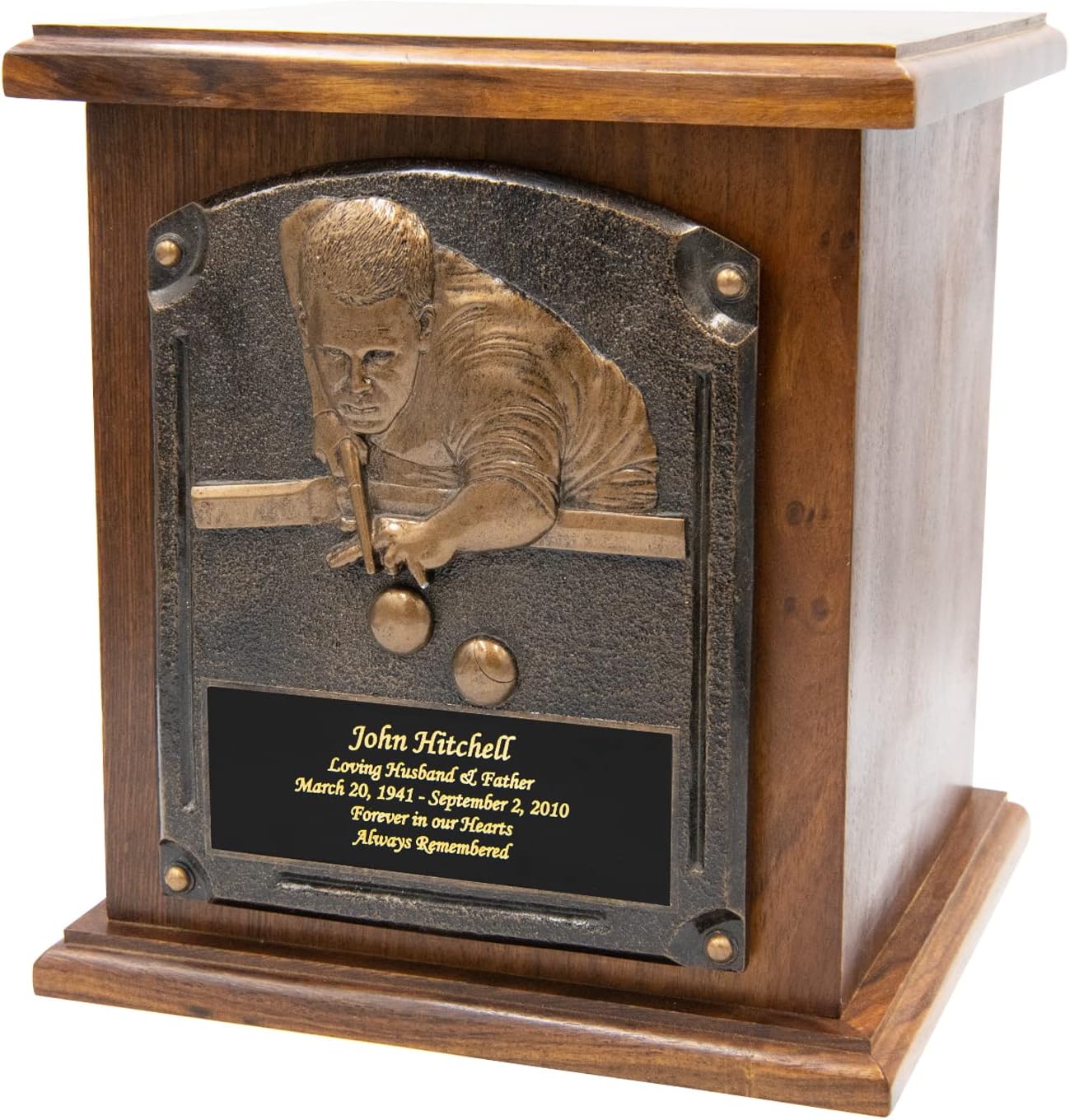 Proudly Honor Your Loved Ones: This adult size beautiful solid wood urn comes with 5" x 7.5" 3D plaque featuring a Pool player and a 1.5" x 4.25" personalized plate to commemorate a loved one. It is an eye-catching work of art for your home while serving as a beautiful resting place for your loved one. Hand crafted With Utmost Care and Quality: Our dedicated team of skilled artists create our urns for ashes with superior craftsmanship and the highest-quality materials. Each urn is constructed of high-quality rose wood and meticulously hand-finished with details to respectfully commemorate your loved one. Dimensions: 9.5"x 8.5" x 7" 260 cubic inch, can hold up to 260 pounds of body weight before cremation. Durable: Our cremation urns for human adult ashes are designed to stand the test of time with their best in class and durable construction. Each Urn is Bottom Loading with a secure bottom opening. The bottom panel is secured by screws. Please use a Philip head screw- driver to undo the screws. Commemorate Your Loved One with a Custom Engraved Tribute: As shown in the picture, the urn can be personalized to honor your loved one for no extra charge. Please click the "customize now” button to personalize the item. We encourage you to thoroughly review the text for engraving carefully before adding the item to cart. We engrave the exact information we receive with the order and do not make any changes on our end.
