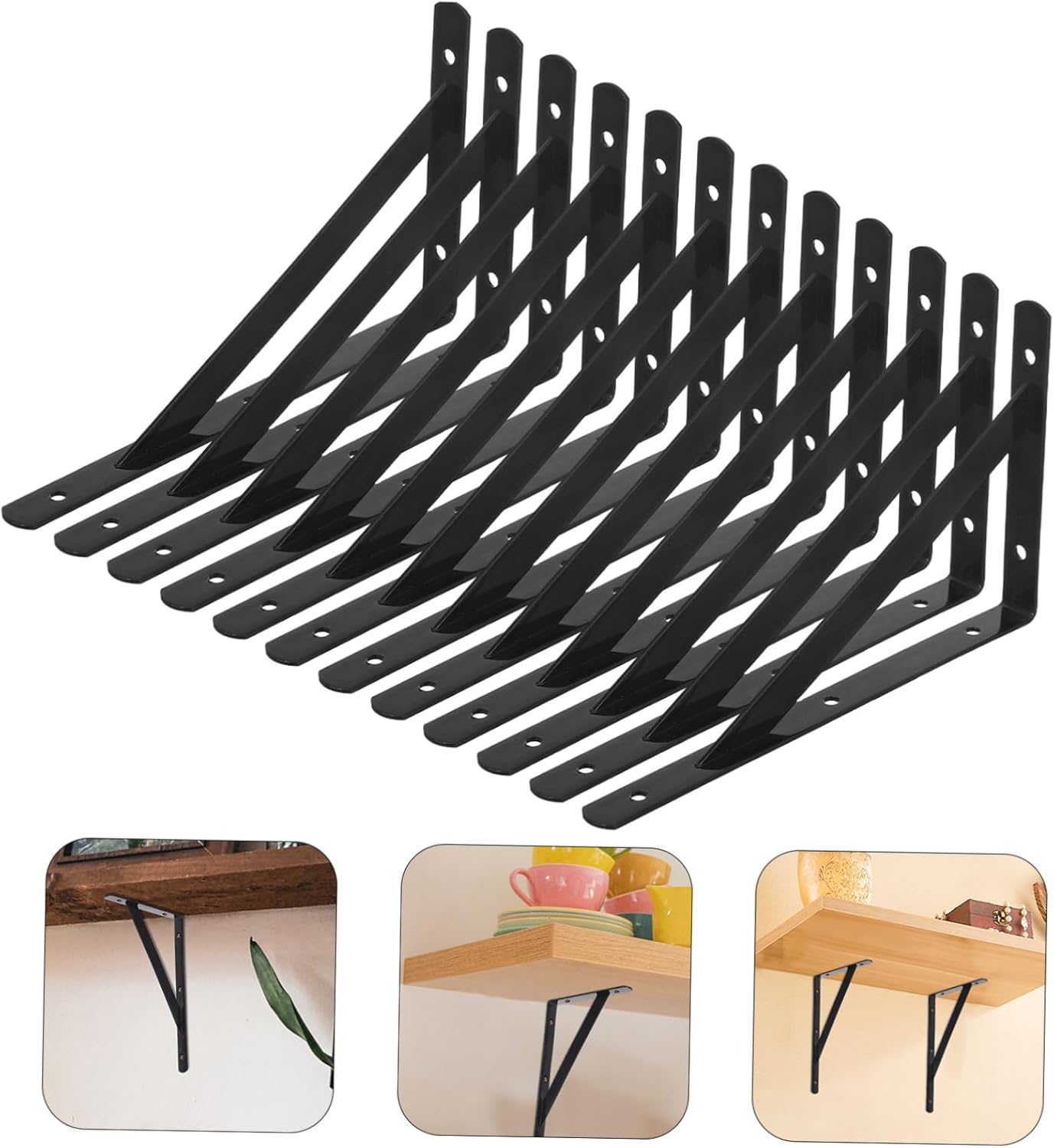 Package Include 12 shelf brackets x expansion tubes x long screws 36 x short screws Features -Versatile design: suitable for most furniture styles, these brackets for shelves add an artistic touch to your house shelf brackets -Color:Black metal shelf brackets -Space saving: these shelf brackets are nice for support wood shelving, such as bookshelves, garden shelves floating shelf support -Size:20.00X12.00X1.60cm/7.86X4.72X0.63in shelving brackets heavy duty -Wide application: ideal for kitchens, bathrooms, bedrooms, offices, and more, these wall mounted shelf brackets can be used for wood shelf installation shelf hangers brackets -Easy installation: the shelf bracket set comes with screws and expansion tubes, making it simple to install hanger shelf -Sturdy to use: made of strong iron, these shelf brackets are built to last, provide strong support for your shelves, ensuring stability and durability for various applications cast iron shelf brackets -Material:Iron metal bracketGoods Informationshelf hangers brackets These shelf brackets are designed to provide sturdy support for your wall-mounted shelves.shelving brackets The sleek, minimalist design ensures they blend seamlessly with any decor, making them nice for both modern and traditional interiors.decorative wall shelf brackets Crafted from iron, they offer a and sturdy for holding up various of shelving