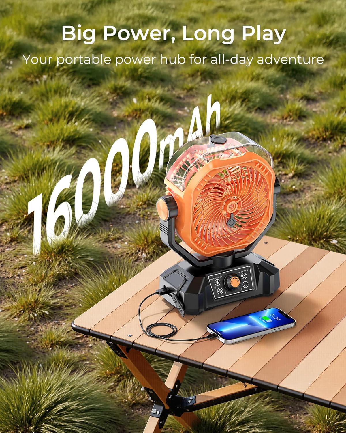 • 16000mAh Large Battery: This rechargeable camping fan is equipped with 16000mAh battery - enjoy up to 18-70 hours of refreshing breeze on a single charge, with only 10 hours required for a full recharge. In addition, The fan battery operated is equipped with Type-C input and USB output port, which is convenient for charging the cordless fan, making it a great choice for camping trips, power outages, hurricanes, etc.