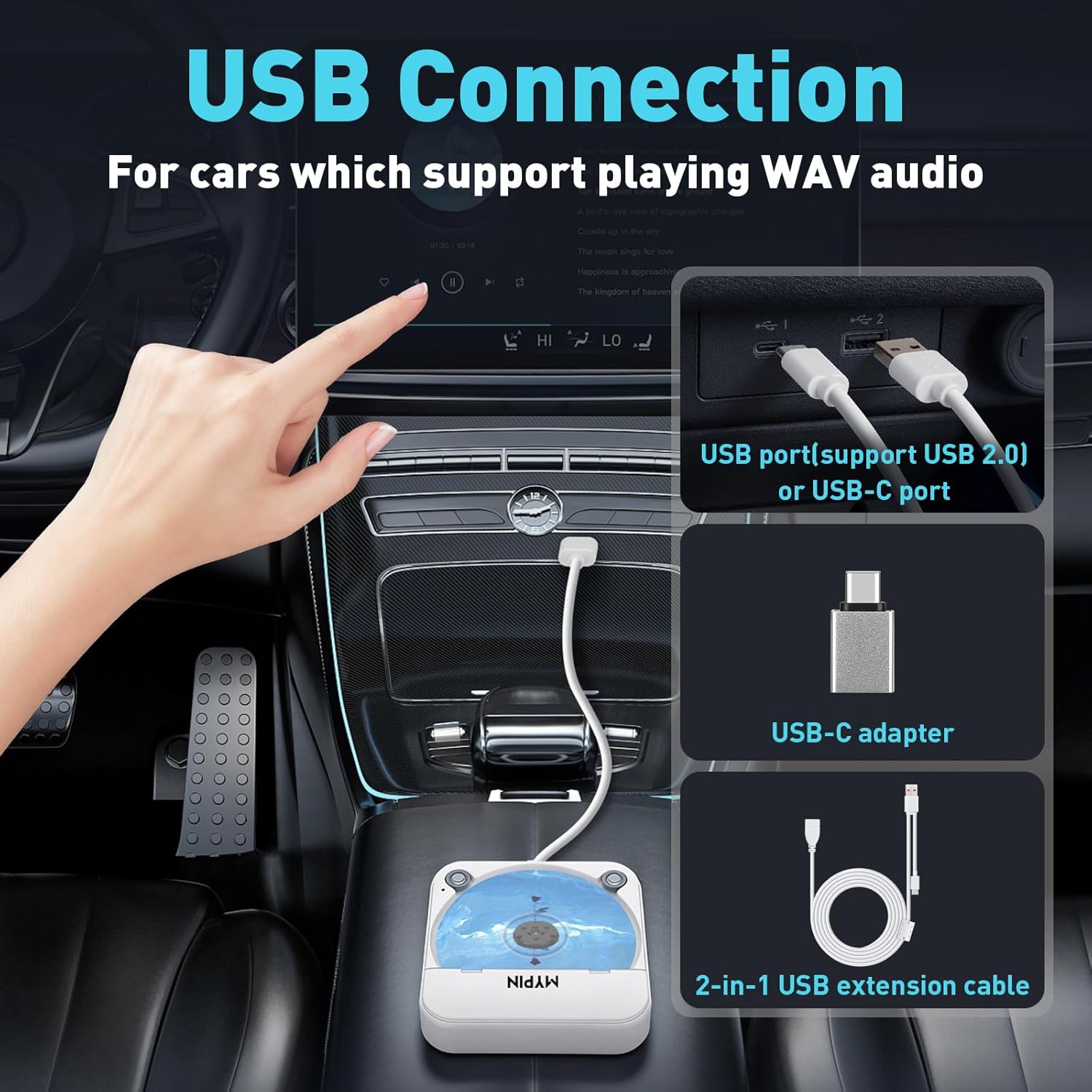 | BuiltIn Media | 1x External portable car CD player, 1x AUX audio cable, 1x Remote control, 1x USB-C adapter, 1x USB-C cable, 1x User manual |