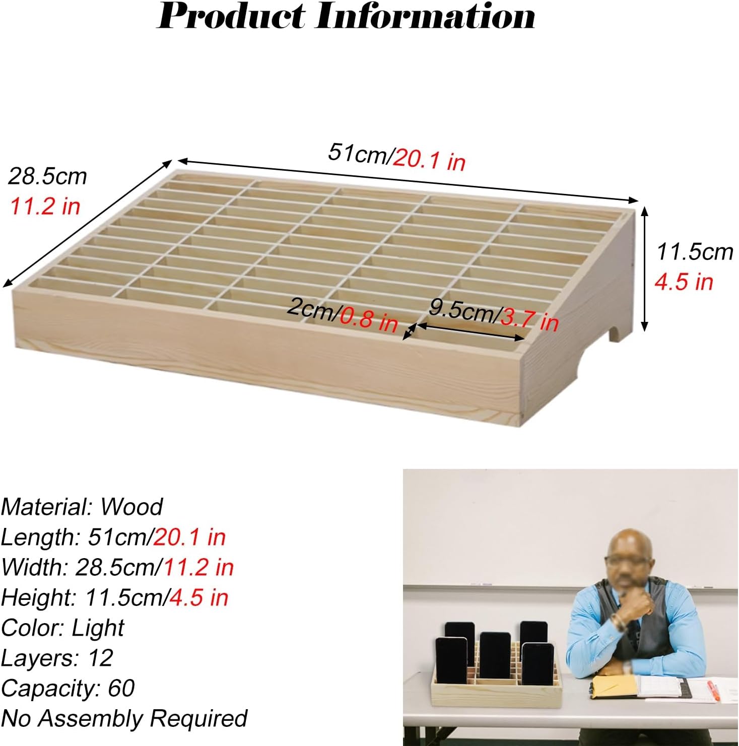 Are you concerned about keeping your cell phone secure during gym workouts? Do you wish to minimize distractions in the classroom caused by students' devices? Our Cell Phone Lockers are the perfect solution for safely storing and organizing your phone in various settings, enhancing both your productivity and focus. Crafted from durable wood, our lockers require no assembly, making them easy to use right out of the box. With multiple sizes available, you can choose the perfect fit for your needs: - **6 Layers, 12 Capacity**: Compact design (21 cm x 15 cm x 9 cm) for small spaces. - **8 Layers, 24 Capacity**: Balanced dimensions (30 cm x 19 cm x 10 cm) for moderate needs. - **12 Layers, 36 Capacity**: Spacious option (30 cm x 27.5 cm x 11.5 cm) for larger groups. - **12 Layers, 48 Capacity**: Ample storage (40.5 cm x 27.5 cm x 11.5 cm) for busy environments. - **12 Layers, 60 Capacity**: Generous configuration (51 cm x 28.5 cm x 11.5 cm) for maximum organization. Our cell phone lockers feature a clear design that allows you to effortlessly see and manage your devices, ensuring they remain safe and secure. With a layered structure, finding your phone has never been easier, and it accommodates various smartphone models. Ideal for classrooms, seminars, and gyms, our storage solution reduces the temptation to check devices during critical moments, allowing for improved concentration and engagement. The ergonomic curved hand rest makes it simple to move and transport, providing convenience wherever you need it. Package includes one Cell Phone Storage Locker. Please note: minor size variations may occur due to manufacturing processes, and colors may vary slightly depending on lighting conditions. Invest in our Cell Phone Lockers to promote a distraction-free environment and streamline your organizational needs today!