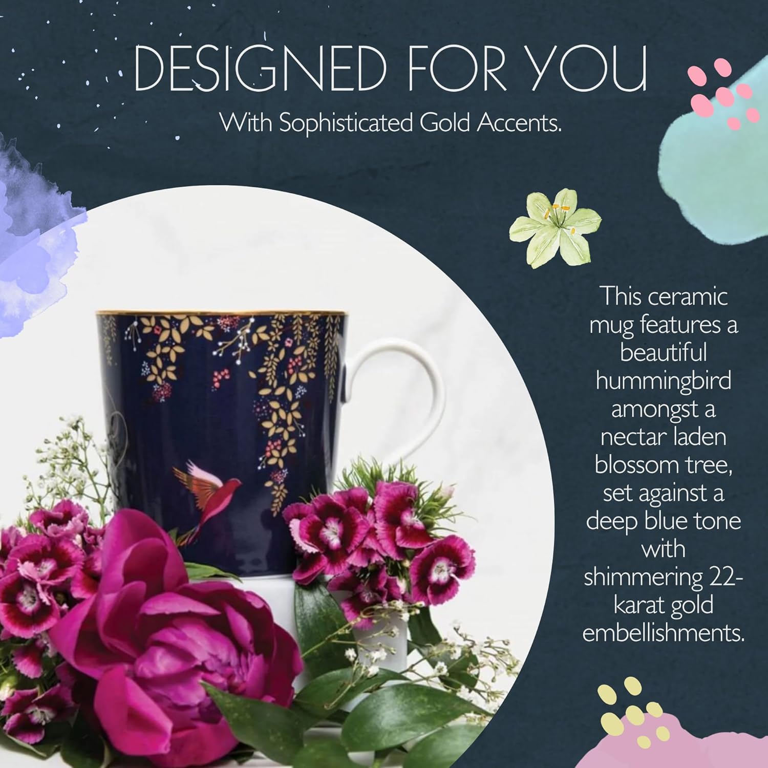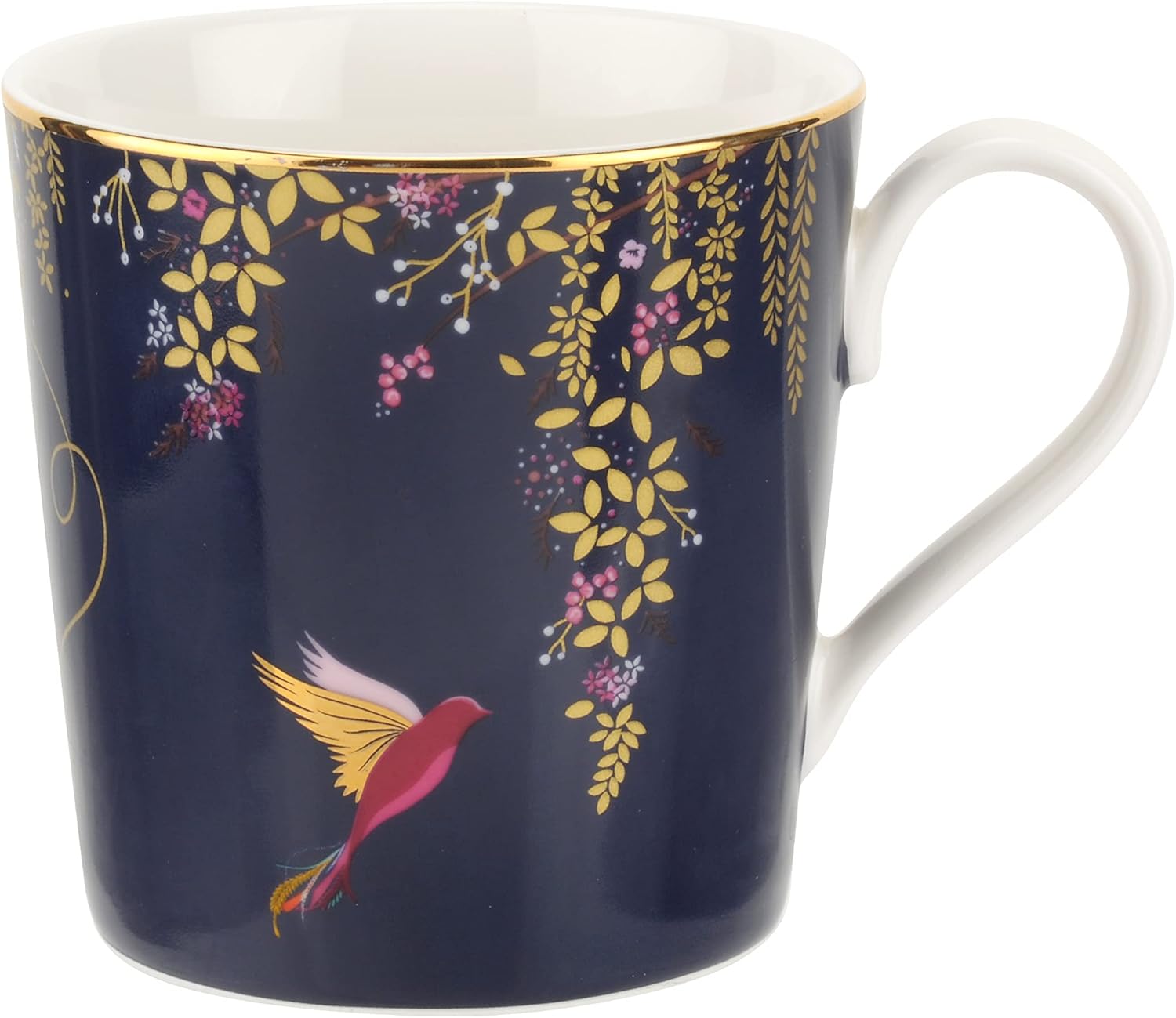Product description Bring charm and artistry to your daily rituals with the Portmeirion Sara Miller Chelsea Mug in Navy. Designed with Sara Miller's signature touch, this 12oz ceramic mug showcases a delicate bird resting amongst a nectar laden blossom tree, set against a rich navy blue background. Every detail is accented with 22-karat gold, giving the mug a subtle shimmer that catches the light beautifully and adds a refined flair to each use. Crafted from fine china, this drinkware piece balances elegance and everyday practicality. Whether you're enjoying your morning coffee or indulging in a slow, soulful cup of tea, the mug enhances the moment with both style and comfort. Its gently curved handle and smooth finish offer a pleasant grip, making it suitable for everything from casual sips to a more elevated afternoon tea set experience. The mug comes in a beautifully designed gift box, making it an ideal choice for birthdays, host gifts, or thoughtful surprises. It's not just a mug—it's an invitation to savor your day. Elevate your tea ritual, complement your high tea presentation, or simply enjoy the artistry in your hands. This Sara Miller mug blends practicality with beauty, creating a standout piece in any tea time collection. Set Contains: 1 x mug