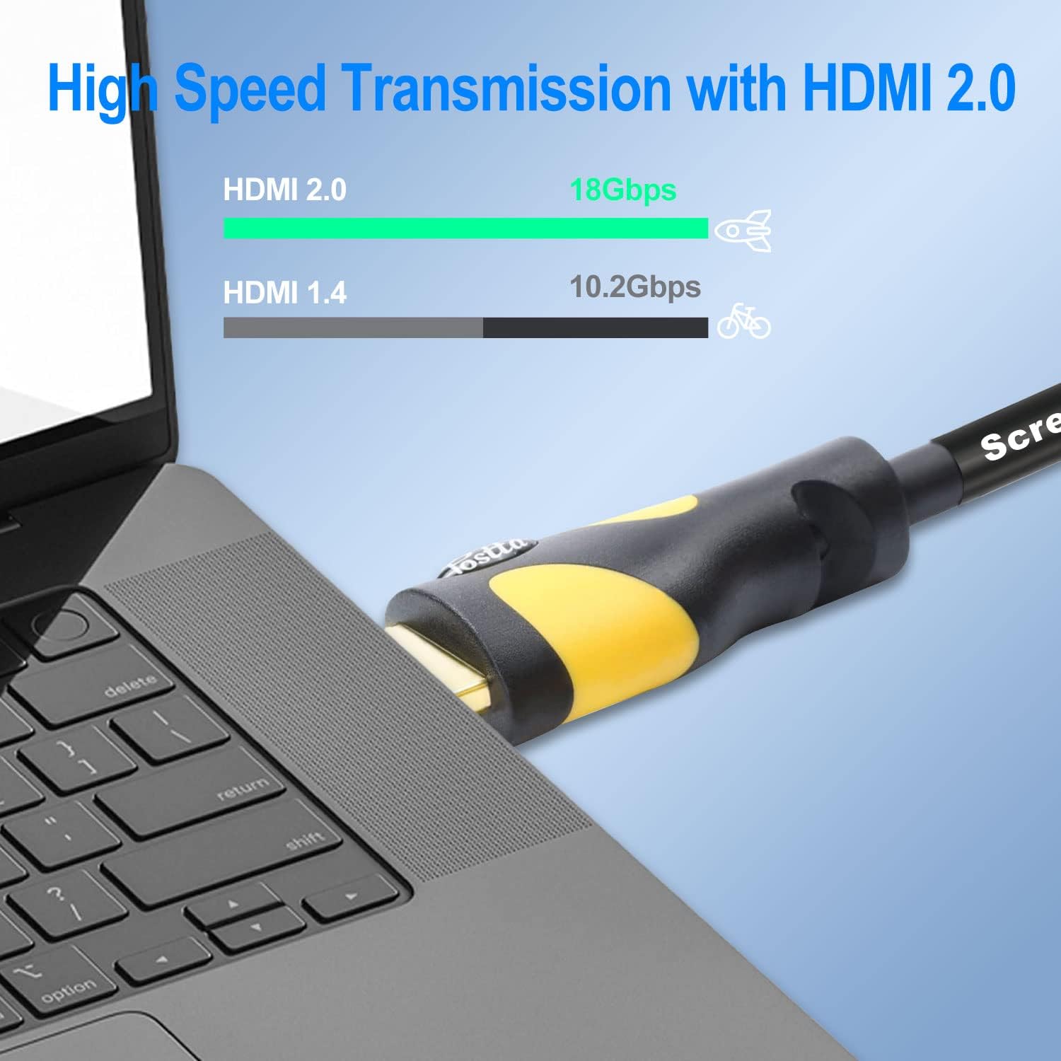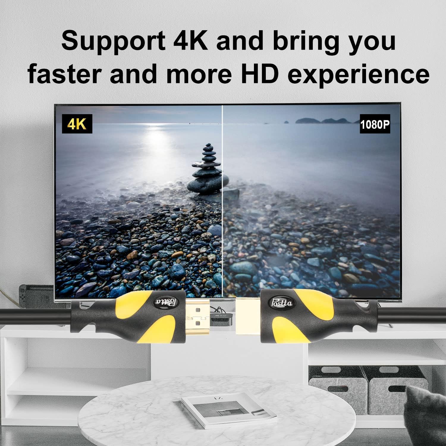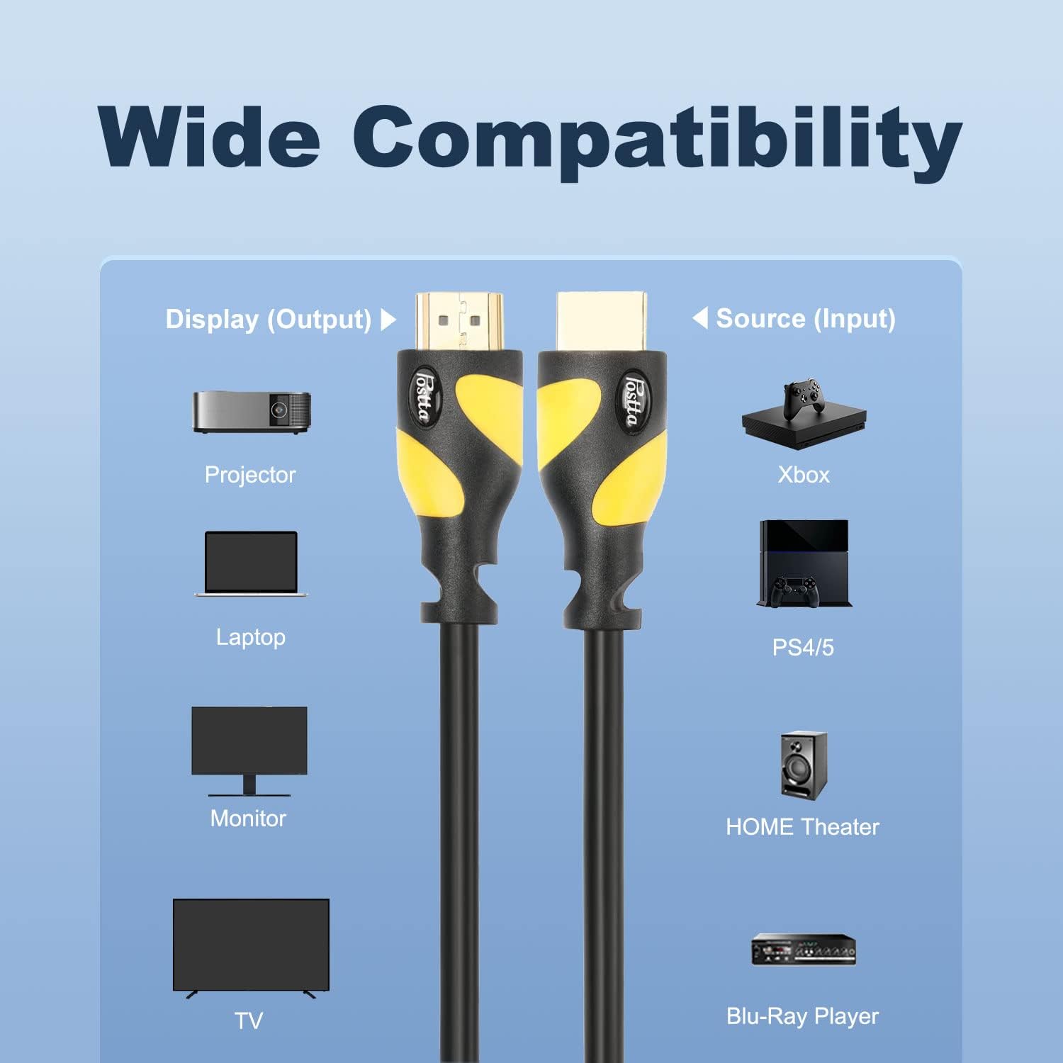 Postta 100 Feet HDMI Cable can compatible with Blu-Ray player,PS3,PS4,XBOX 360,DVD Players,3D TV's,Computer,Home Entertainment device and other HDMI-compatible device. Product Features Cable use 24K gold plated connectors and high-quality PVC material,CL3 rated for in wall installations,with environmentlly-friendly,wear-resisting and aesthetic features to ensure the using process more secure and reliable. The cable can support 3840*2160,3D,1080P,Ethernet Channel,Audio Return Channel and more. The cable can reach 18Gbps transfer speed and bring you faster and more HD experience. Fit Blu-Ray player,PS3,PS4,XBOX 360,DVD Players,3D TV's,Computer and more HDMI-compatible devices. Product Specification HDMI2.0 Version OD:8.5 ± 0.2mm 99.99% Oxygen Free Copper conductors 24K Gold Plated connector High-quality PVC material With CE,ROHS and REACH Certification 1 Year Warranty PLEASE NOTE INPUT(Source):Connect Laptop,PC,DVD,Cable Box,TV Box,Blu-Ray Player and more source device with HDMI Port.OUTPUT(Screen):Connect HDTV,Monitor,Projector and more display devices with HDMI Port.
