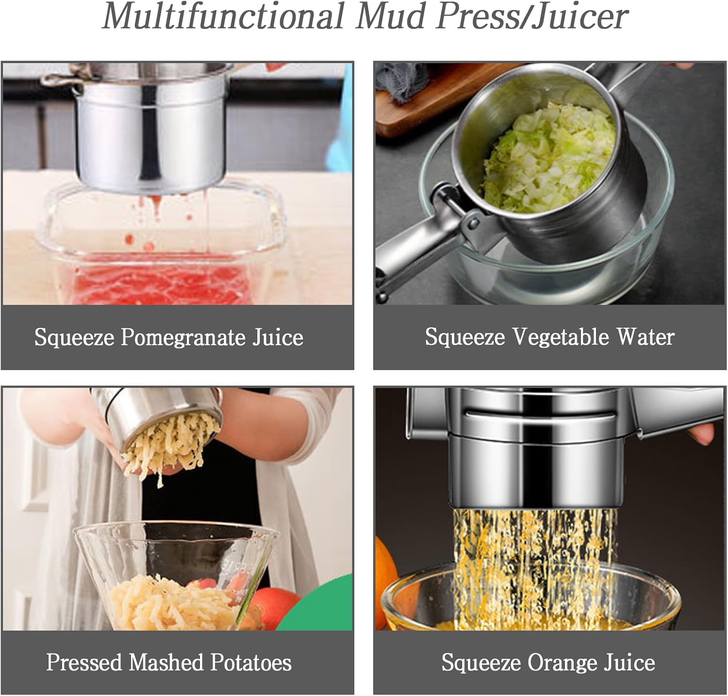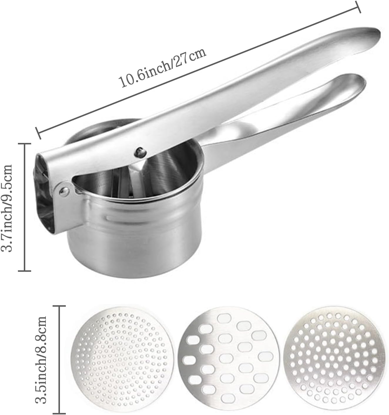 For smooth and fluffy mashed potatoes, a stainless steel potato ricer is the best tool. This gadget gently breaks the potatoes into tiny flaky pieces, creating a uniform texture, light fluffy perfect potatoes.For family dinners, garden parties, and other activities mashed potatoes are a great choice in your menu. Our mashed potato ricer can help you make silky and creamy mashed potatoes in a time-saving and labor-saving way. Let you share delicious food with family and friends and have a good time. Come and buy it and become a good helper in your kitchen!Package Includes:1 x Stainless Steel Potato Ricer Masher3 x Interchangeable discs