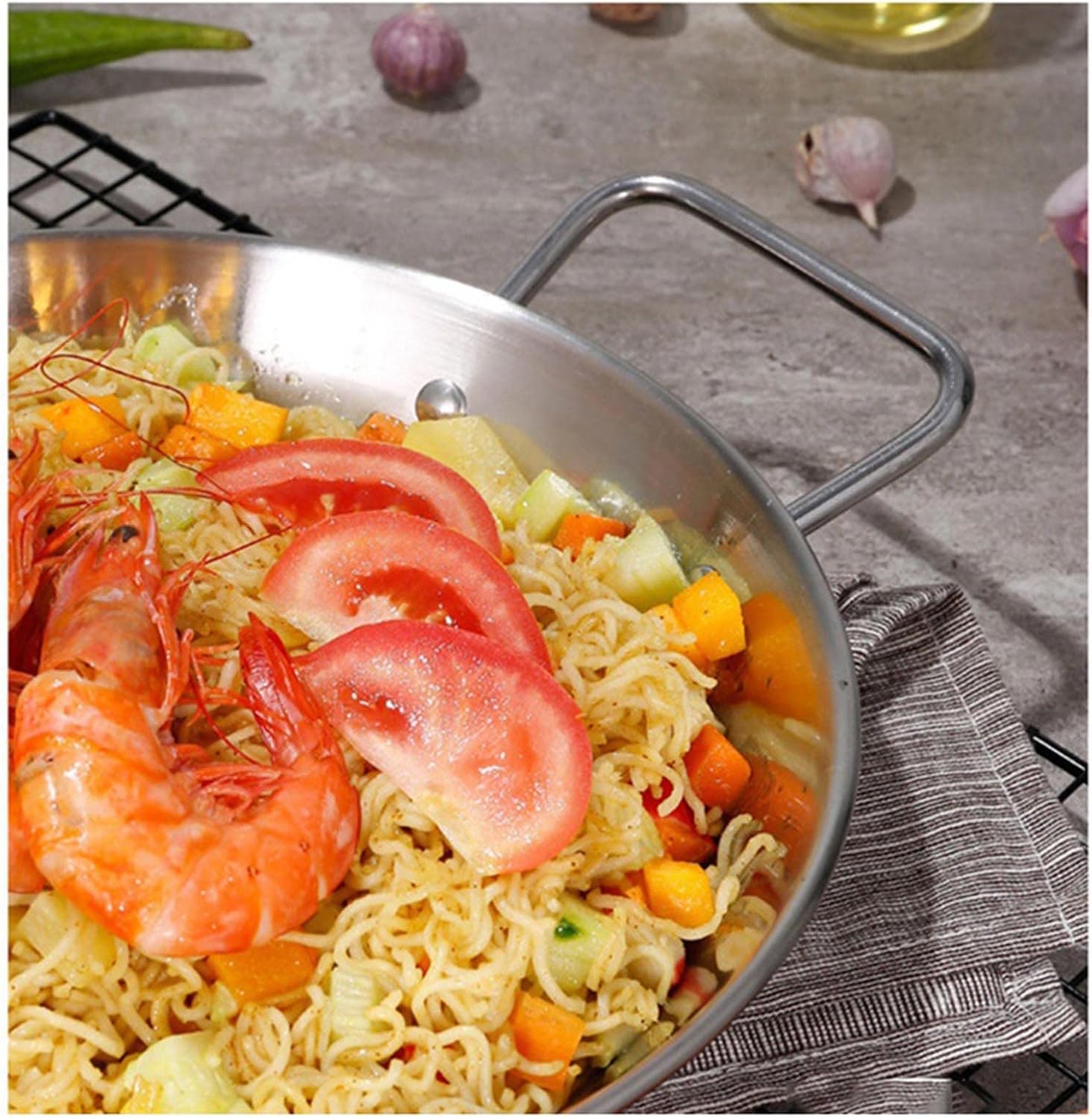 Stainless Steel Non-Stick Paella Pan Spanish Seafryipot Wok Cheese Cooker Cookipan Kitchen CookwarePolished Stainless Steel Offers a Mirror Finish Exterior.Shaped Like a Traditional Saute Pan, But with Two Loop Handles So It Easily Moves from Stovetop to Oven to Table.Premium Stainless Steel Cookidoes Not Discolor, React With, or Alter Flavors.Riveted Widen Handles Are, Comfortable, and Stay Cool to Hold; Dishwasher Safe.Stay-Cool Handles Provide Comfort and Safety.Specification:Name: Spanish SeapotApplicable Places: Induction Cooker, Electric Stove, Outdoor PicnicColour: SilverMaterial: Stainless SteelSize: 28Cm/30CmPackage Contents:1*Seapot