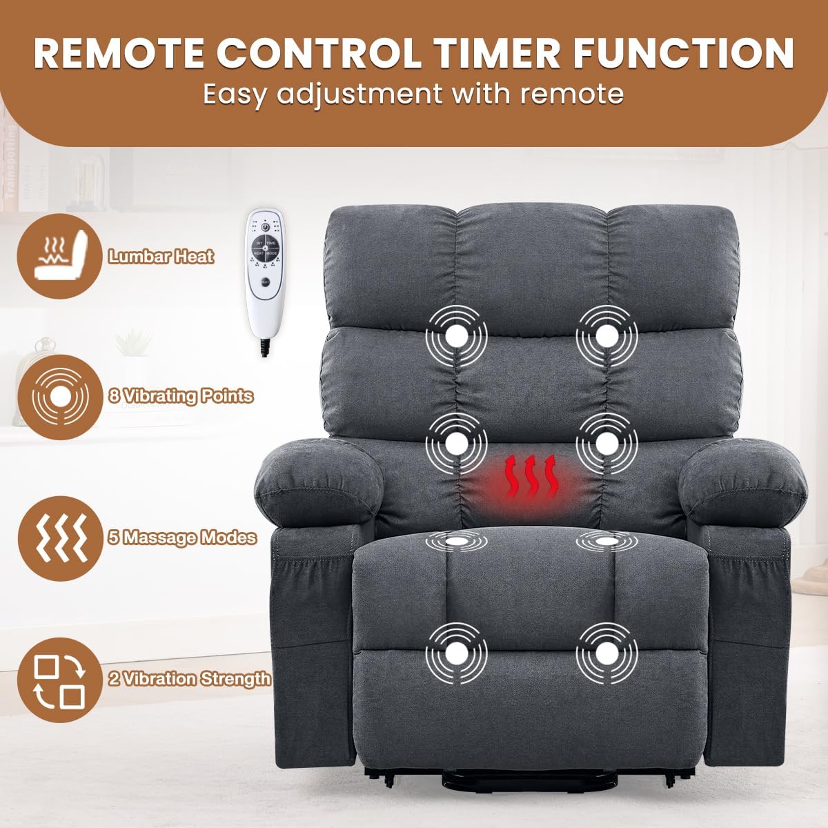 | Additional Features | Power Lift, Recliner, Vibration Massage, Lumbar Heating, Side Pockets, USB Charging Port, Remote Control Operation |