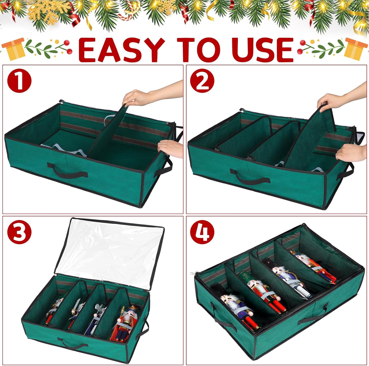 Features: Easy to store: These figurine storage box can be stacked, allows you to easily fold and store it when not in use, without taking up space. Wide use: The Christmas figurine storage containers are ideal for storing various ornaments, bringing some convenience to your life. Specifications: Material: non woven fabric, PVC Color: red, bottle greenSize: about 24 x 16 x 6 inches/ 61 x 40.7 x 15.3 cmPackage includes: 4 x Christmas figurine storage boxNotes: Manual measurement, please allow slight errors on size. The color may exist a slight difference due to different screen displays.