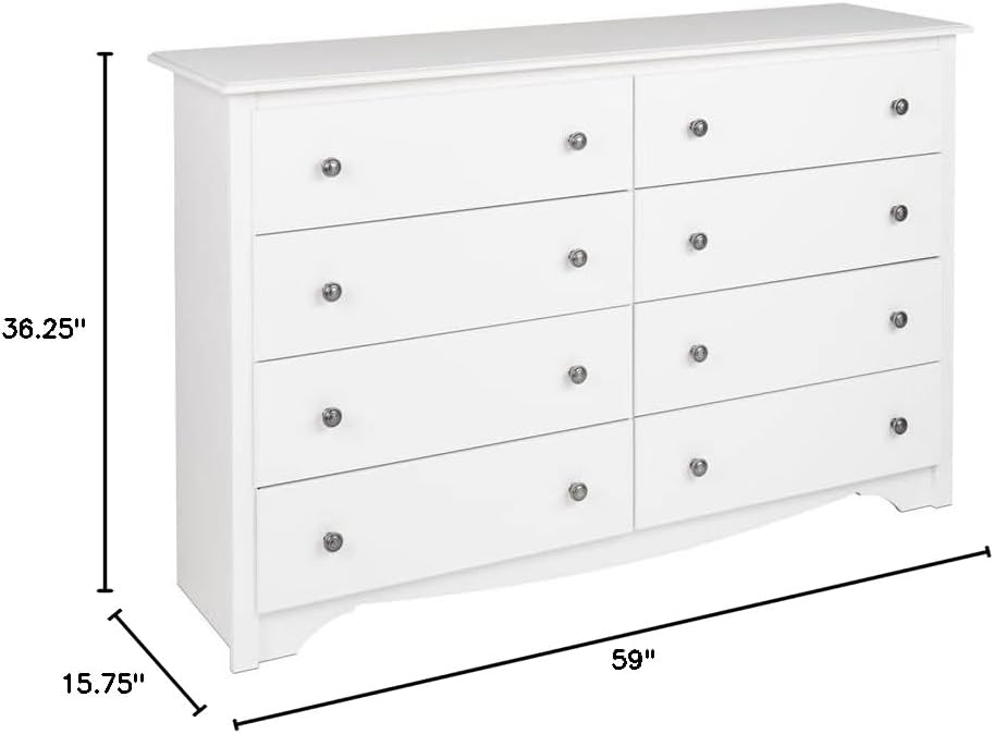 Prepac Monterey 8 Drawer Double Dresser for Bedroom, 15.75" D x 59" W x 36.25" H, WhiteMaximize your clothing storage with the Prepac Sonoma 8 Drawer Dresser. A profiled flat top, softly rounded edges, and curved apron kick plate lend to a charming and modern dresser with a white laminate finish. This double-column dresser houses eight full-size drawers for clothes, running on smooth roller glides with built-in safety stops and brushed nickel metal knobs. This multi-drawer storage dresser is a space-saving clothes organizer for bedrooms, but it also makes for an excellent storage cabinet in your walk-in closet, living room, or entryway. The flat top can serve as a TV stand or a display for small lamps, electronics, picture frames, a fair amount of books, and more. Made from a non-toxic, CARB-2 complaint laminated composite wood, drawer sides of solid pine, and a sturdy back panel for reliable storage. This high-quality dresser ships flat packed and can be assembled in two hours or less. Measuring 15.75" D x 59" W x 36.25" H with each deep drawer measuring 12.5" D x 24.75" W x 5" H, this horizontal double drawer dresser is a must-have piece of bedroom furniture. Pair this all-purpose dresser with other items from the Sonoma collection for a uniform bedroom set.Sonoma Nightstand with Open Shelf, WhiteNot all furniture storage is created equal, and the Monterey Tall 2 Drawer Nightstand with Open Shelf offers proof. Not stopping at two full-sized drawers, both primed for storing all your sundries, this bedside table also offers you an open shelf for those items you don't want totally hidden away. With its scalloped base panel and demure elegance, your bedroom will gain both storage space and a touch of elegant sophistication. Liven up your bedroom's decor by coordinating it with other members of the Monterey Bedroom Collection!
