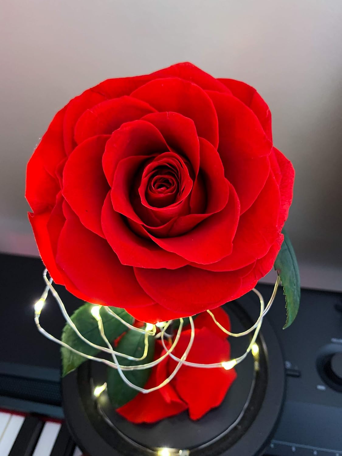 One large preserved REAL rose with fallen petals and LED lights (2 AAA batteries are included). Preserved REAL stems and leaves. Covered with removable glass dome and solid wood base. .Preserved with a unique process that's environmentally friendly, non-toxic and hypoallergenic. Deluxe gift box package is included at no extra charge. A perfect gift for occasions you want to remember forever. Avoid long term exposure to direct sunlight to maintain natural color. No watering is needed.